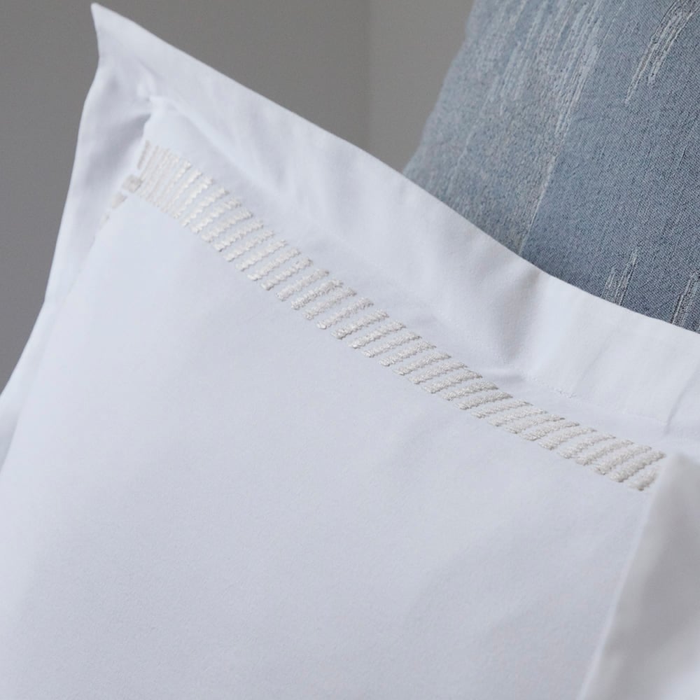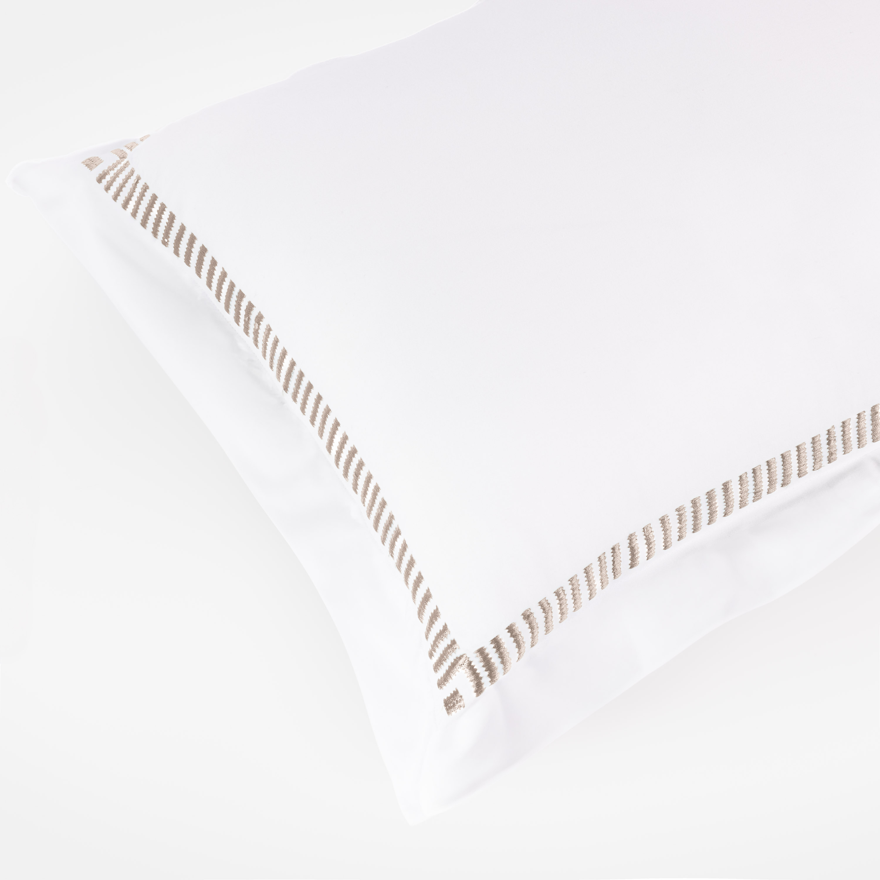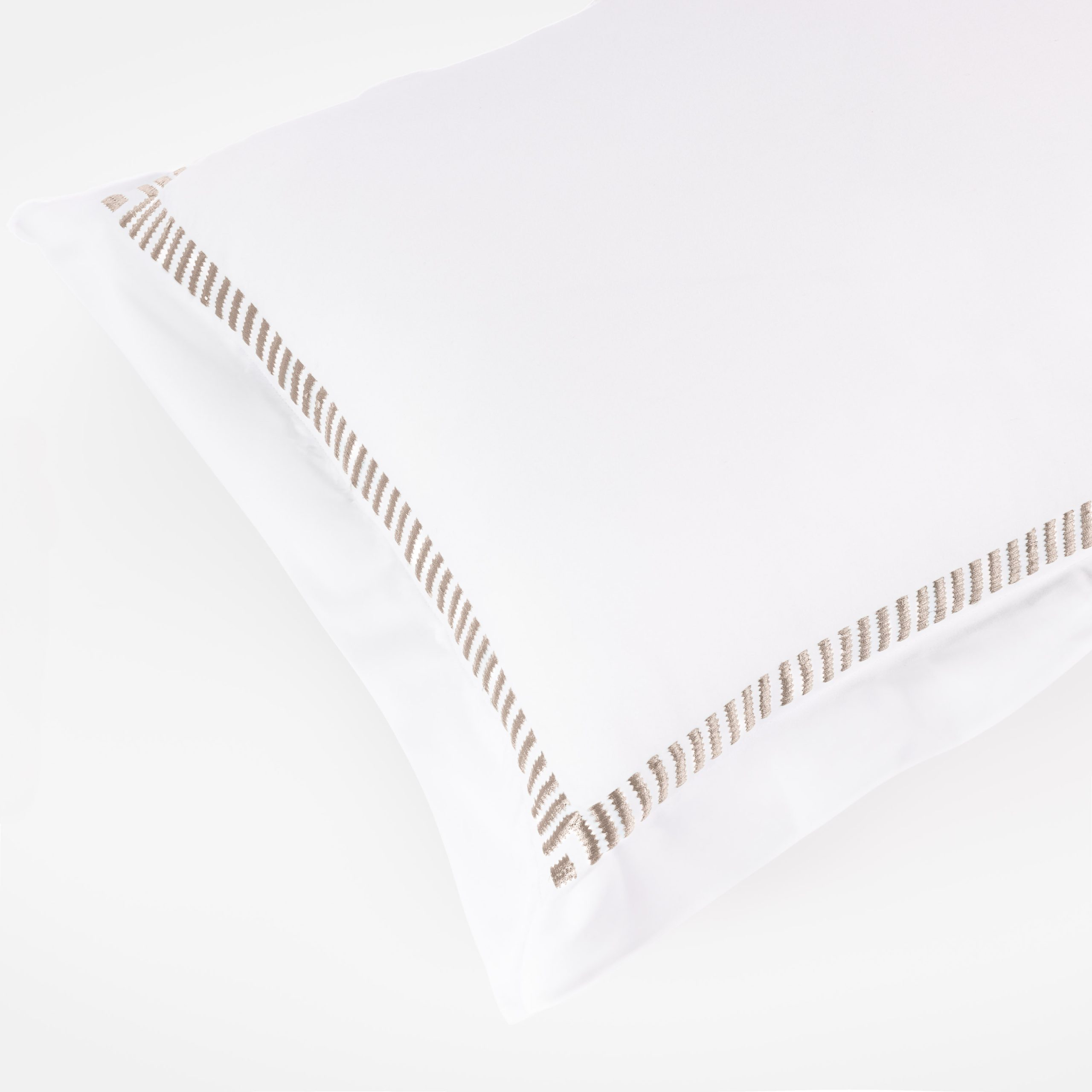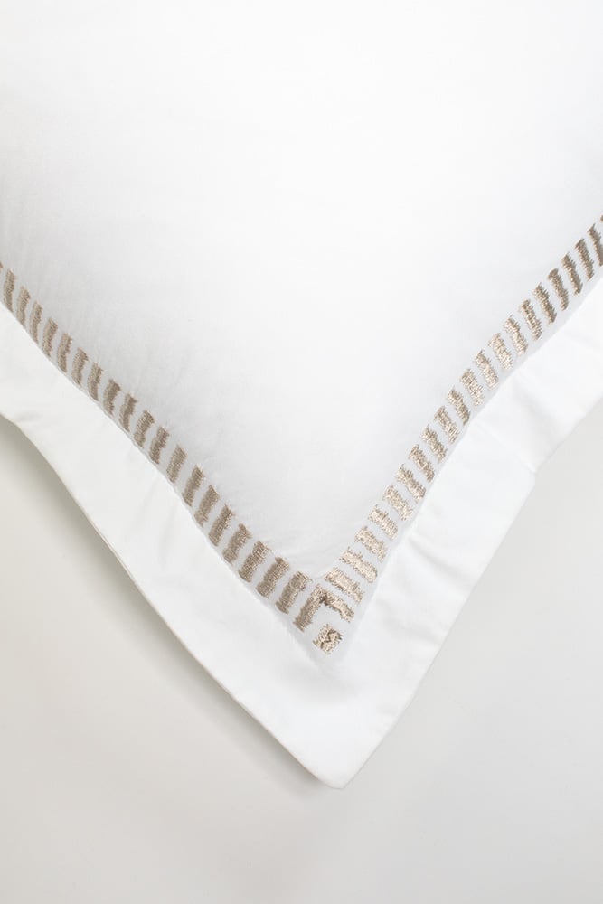 Simply luxurious, this collection is constructed of fine 400 thread count cotton sateen and adorned with embroidered with rhythmic bars embroidery. The sateen weave provides an easy drape and supple hand, while maintaining a crisp appearance. Embroidery in a soft Oyster coloration lends this collection to a wide variety of styles and sensibilities. This transitional motif is stylistically versatile.
