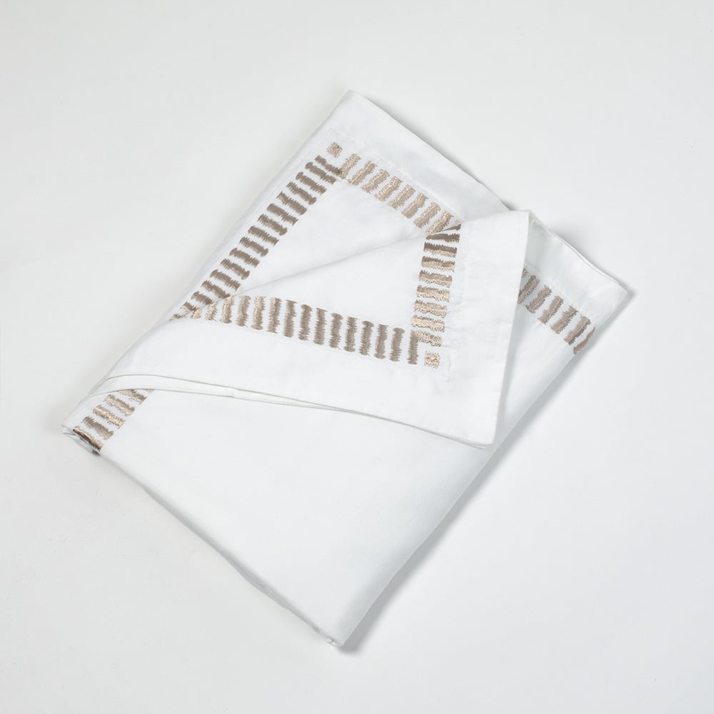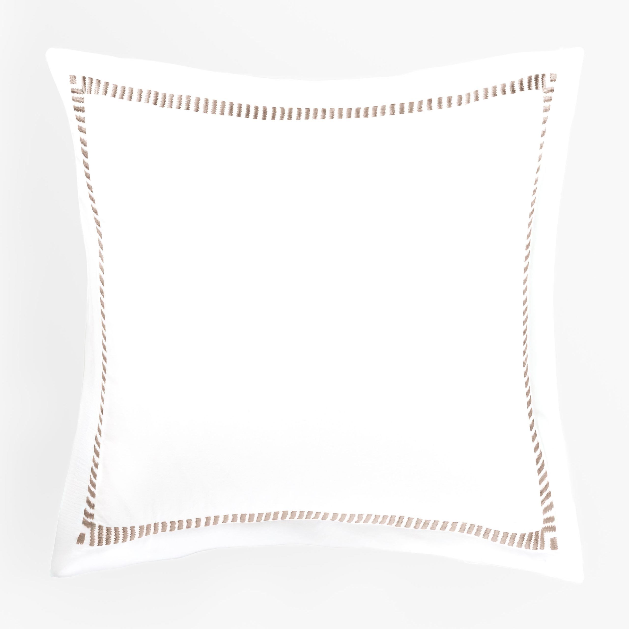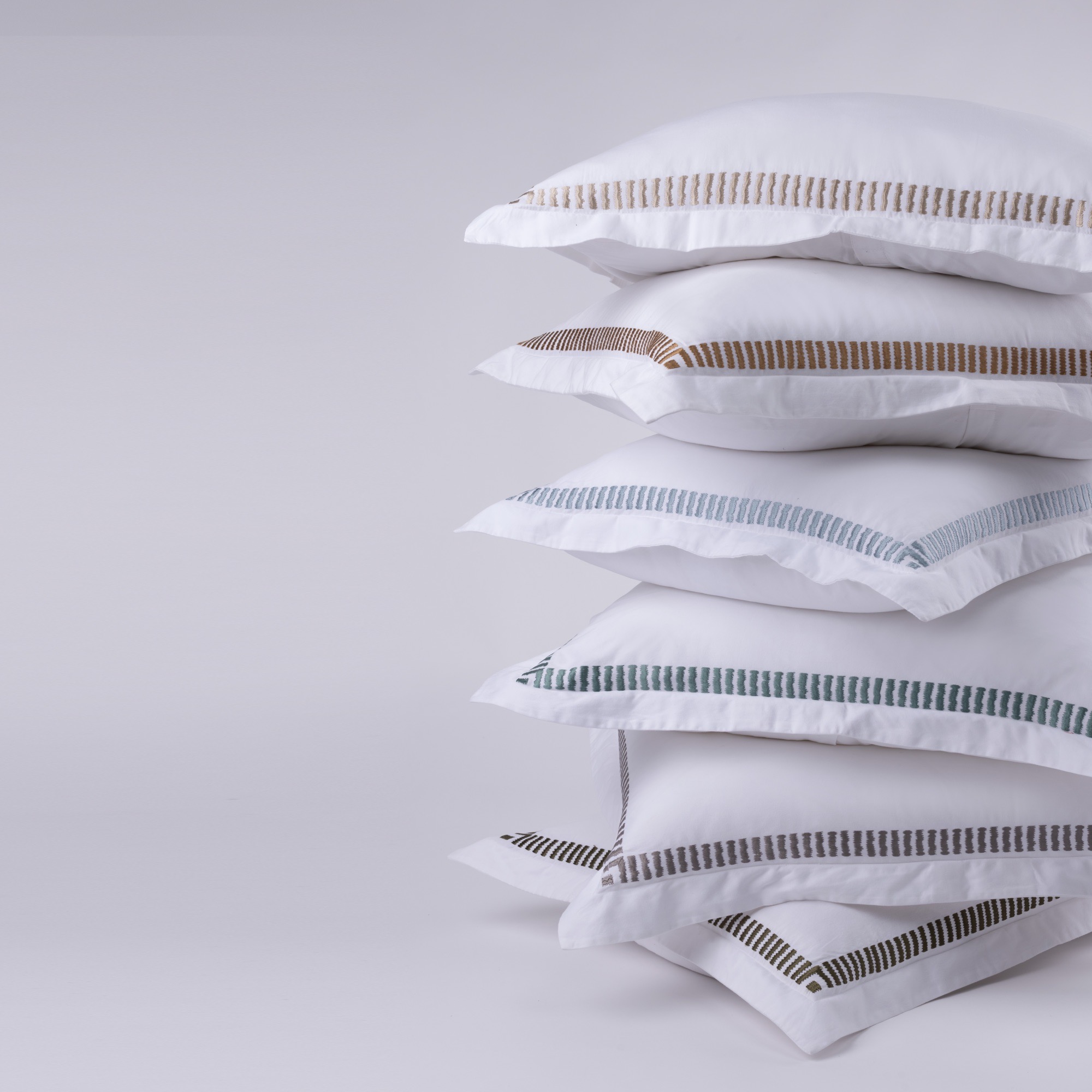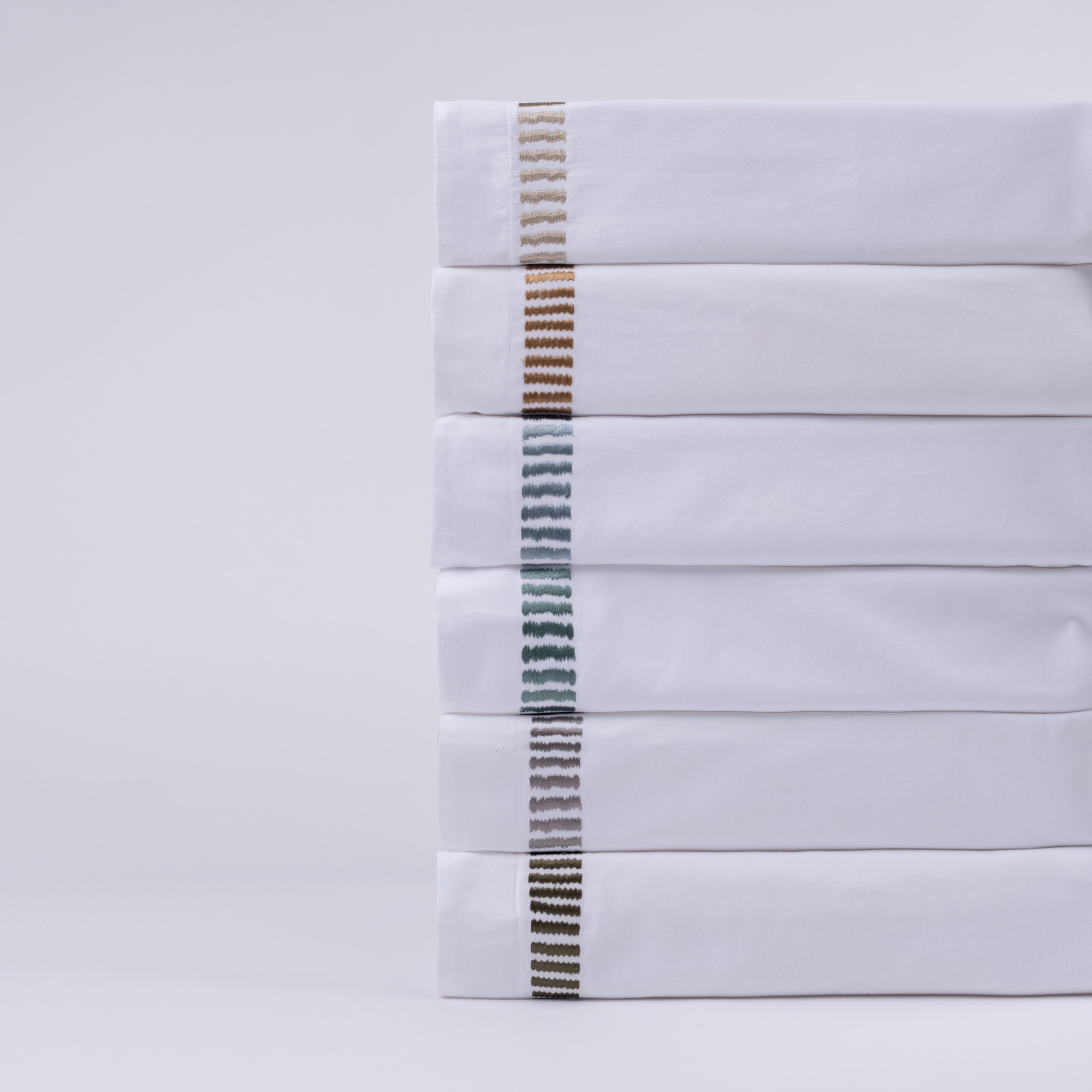 Simply luxurious, this collection is constructed of fine 400 thread count cotton sateen and adorned with embroidered with rhythmic bars embroidery. The sateen weave provides an easy drape and supple hand, while maintaining a crisp appearance. Embroidery in a soft Oyster coloration lends this collection to a wide variety of styles and sensibilities. This transitional motif is stylistically versatile.