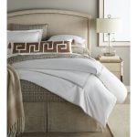 Savona Duvet is simply luxurious, this crisp Cotton Sateen, with a knife edge and embroidered design. The Duvets have button enclosure, 4″ flap inside the opening to hide the filler and ties on all 4 sides to keep the comforter from moving. Shams have 1.5″ straight flange.