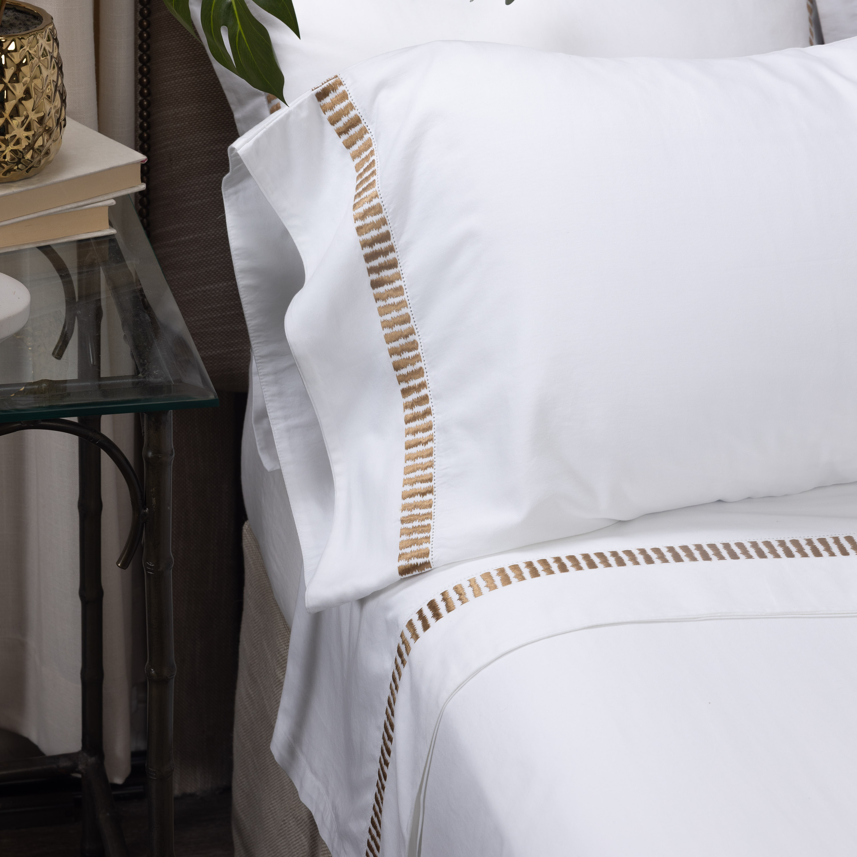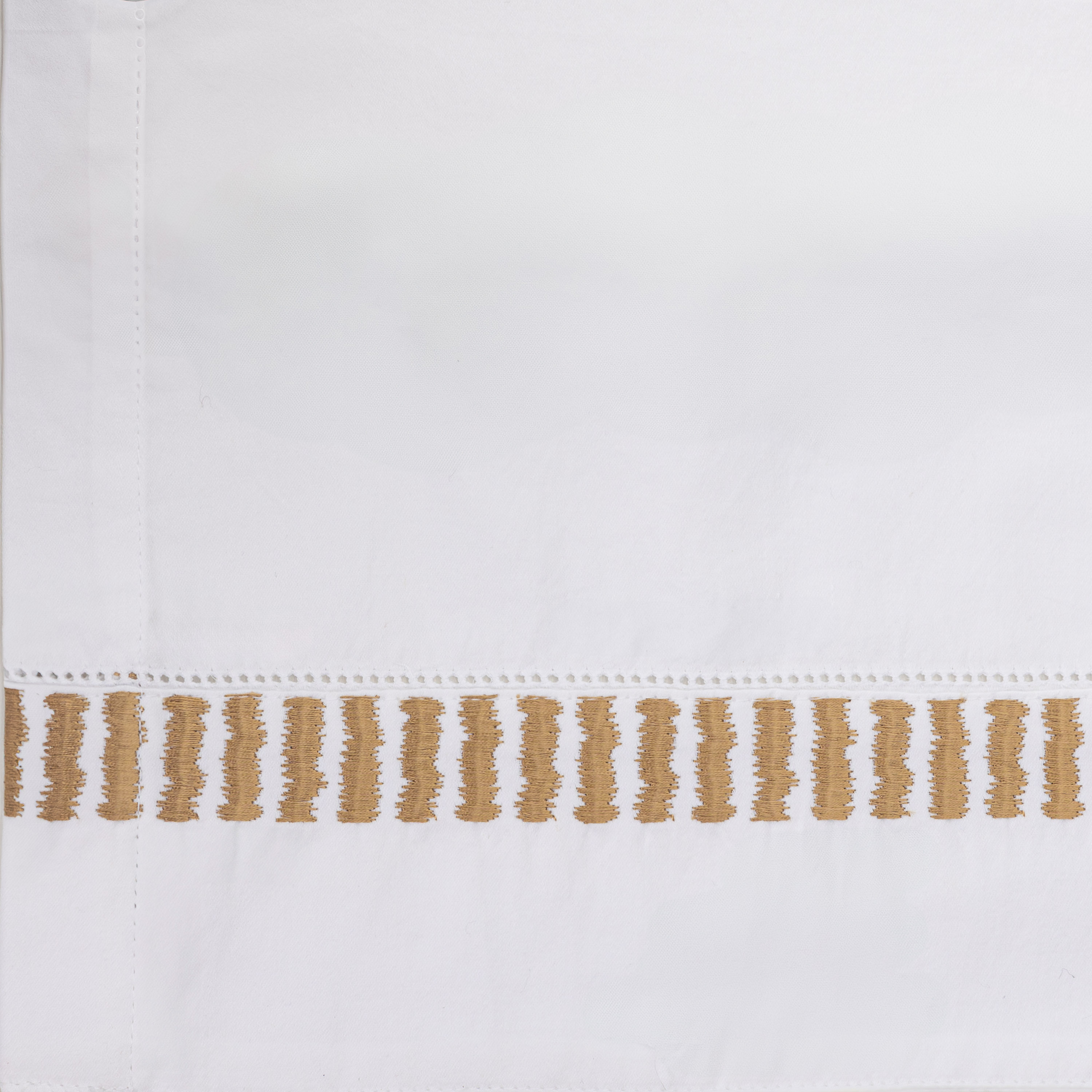 Simply luxurious, this collection is constructed of fine 400 thread count cotton sateen and adorned with embroidered with rhythmic bars embroidery. The sateen weave provides an easy drape and supple hand, while maintaining a crisp appearance. Embroidery in a soft Caramel coloration lends this collection to a wide variety of styles and sensibilities. This transitional motif is stylistically versatile.