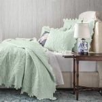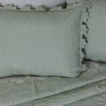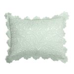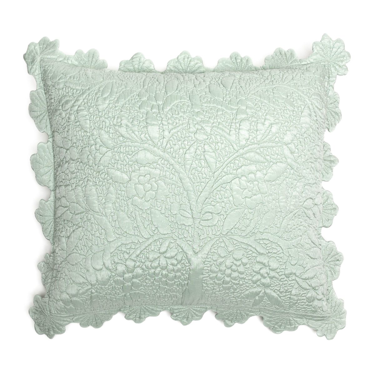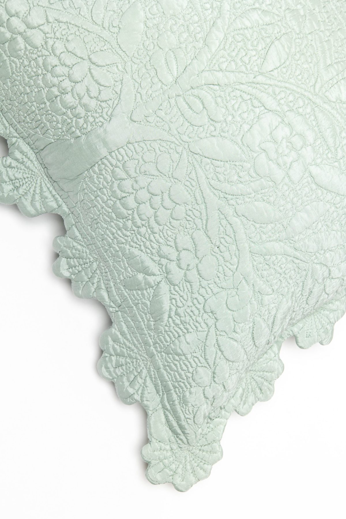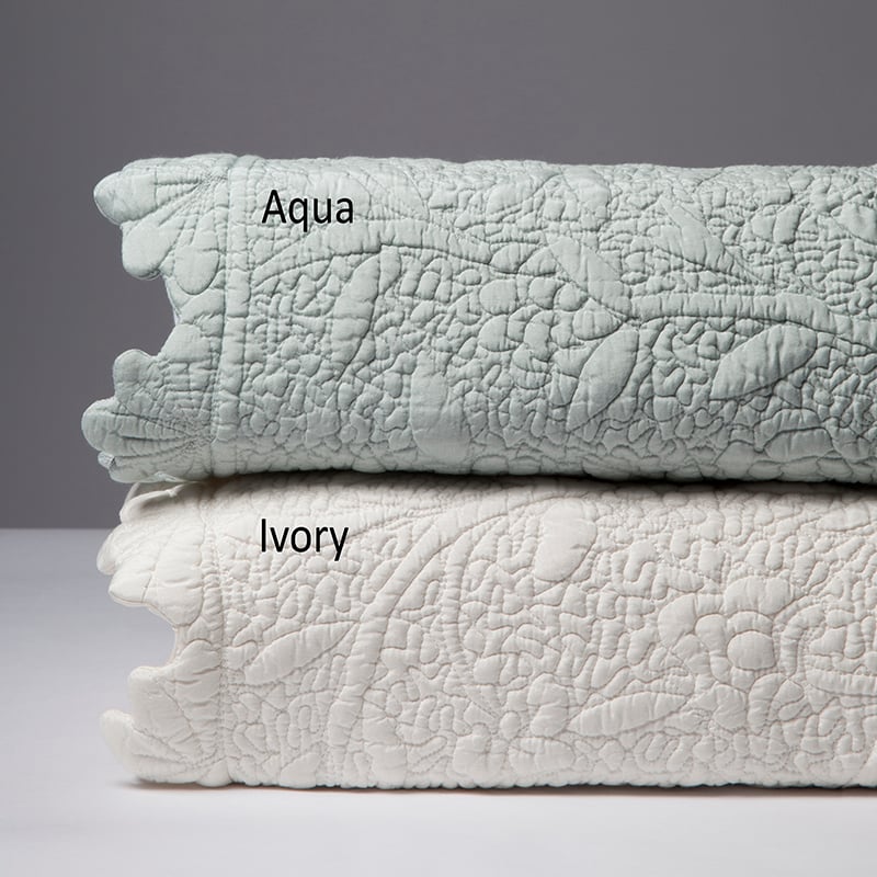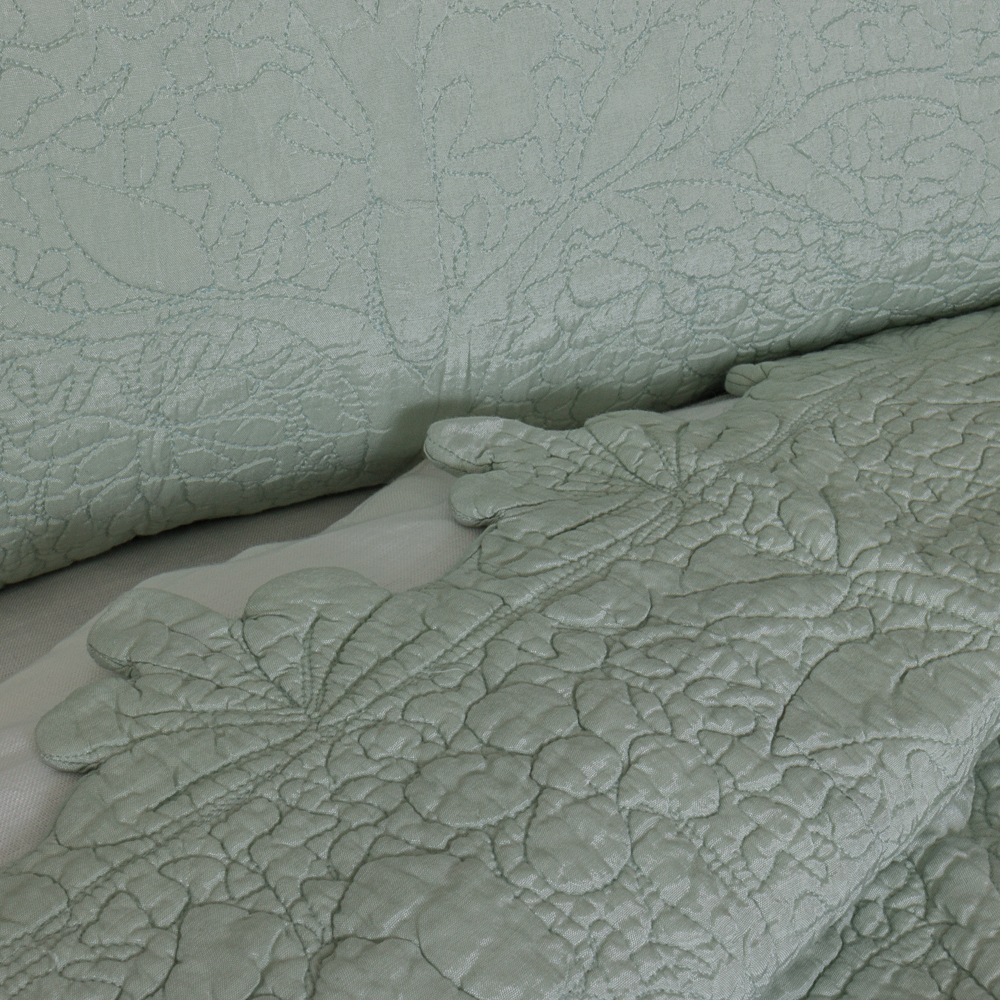 The intricate quilting detail on the Shantoon quilt is guided by hand to achieve the delicate raised scroll motif. The rayon ground and dramatic scalloped edge lends a dressy air to this traditional collection.