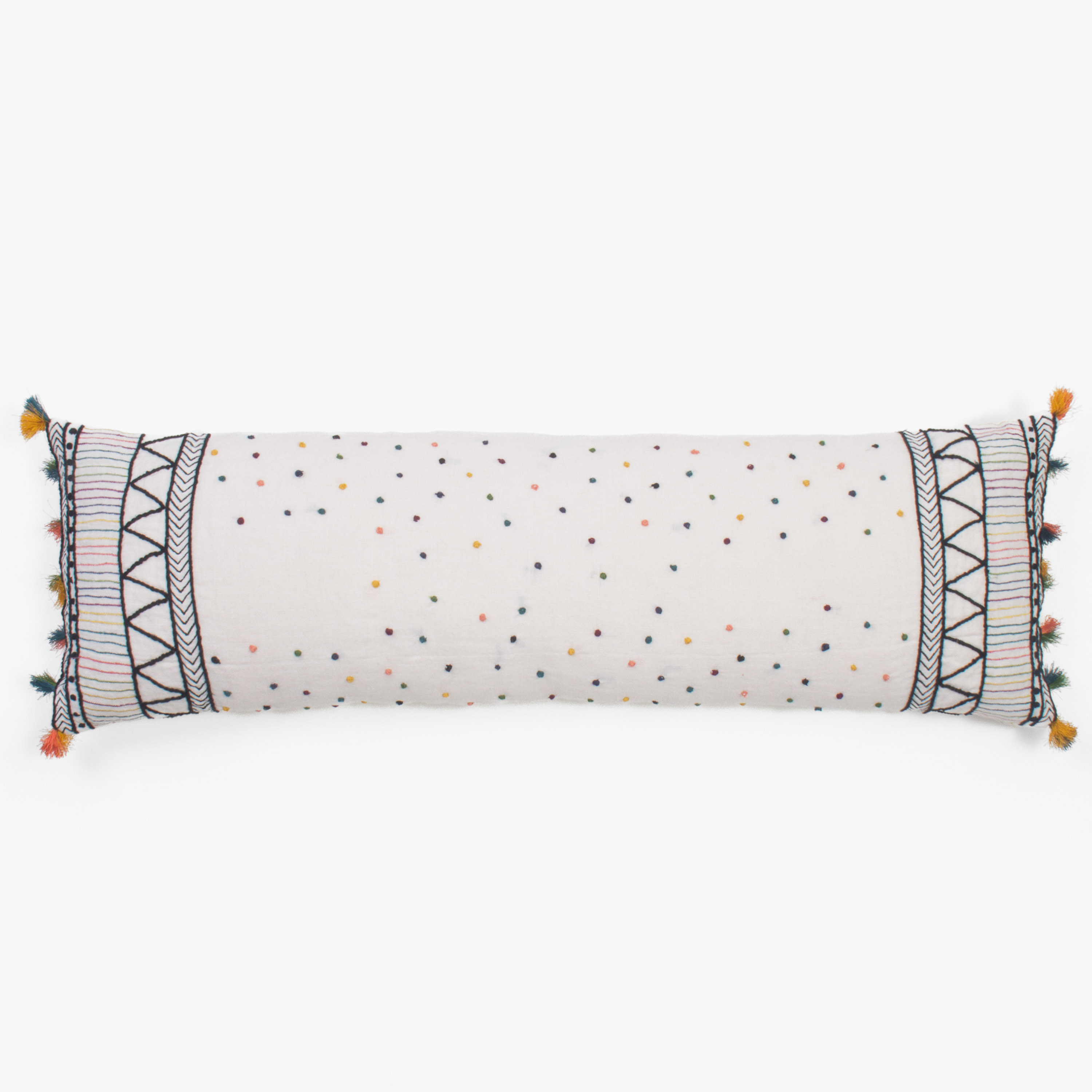 Whimsical yet refined, this extra-long bolster pillow is crafted from soft cotton and adorned with delicate multicolor embroidery, creating a subtle polka-dot effect. Intricate geometric borders and hand-tied tassels in jewel tones add a sophisticated artisanal finish. Designed to elevate any bed or settee, it brings a playful elegance and global charm to luxury interiors.