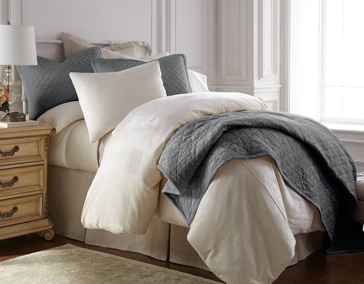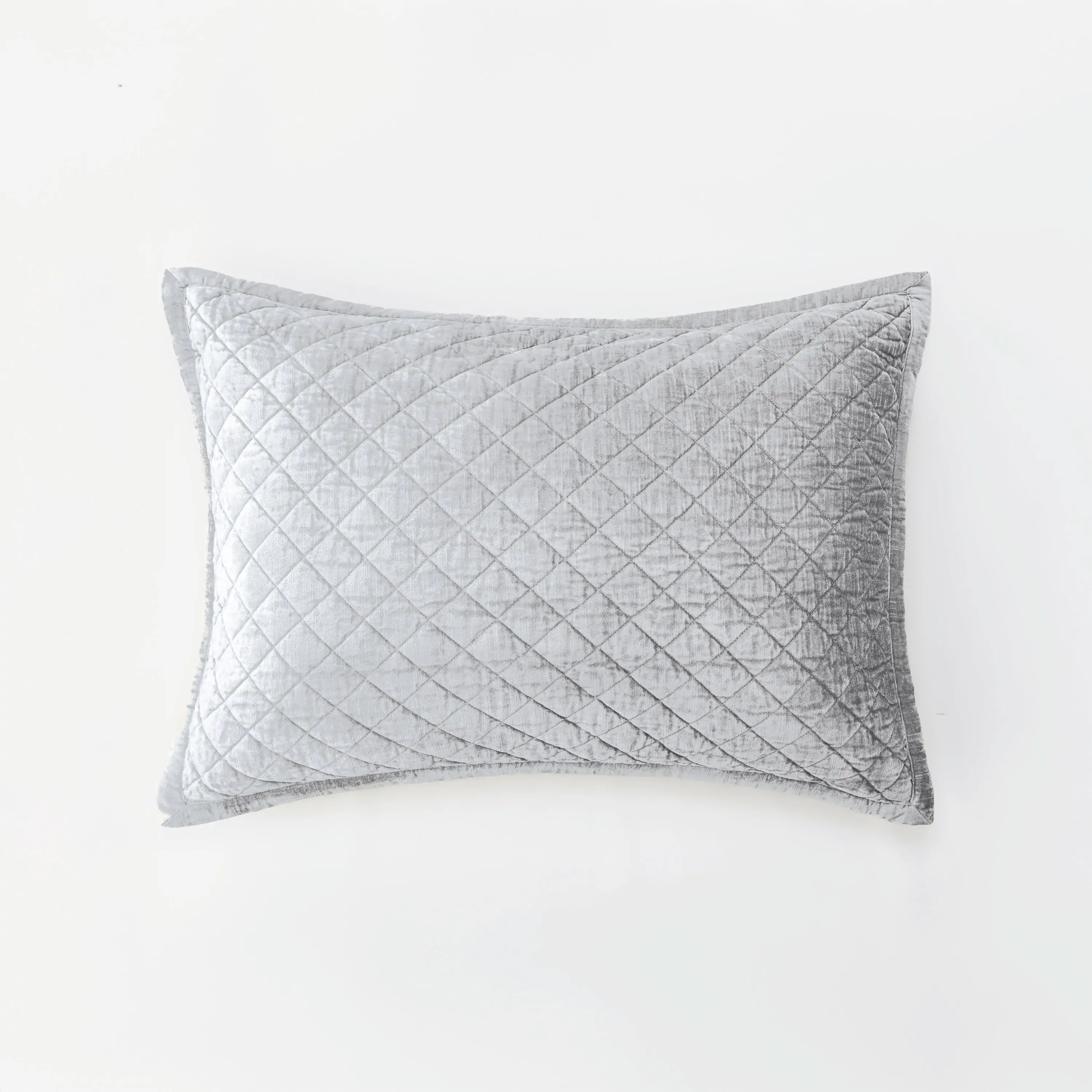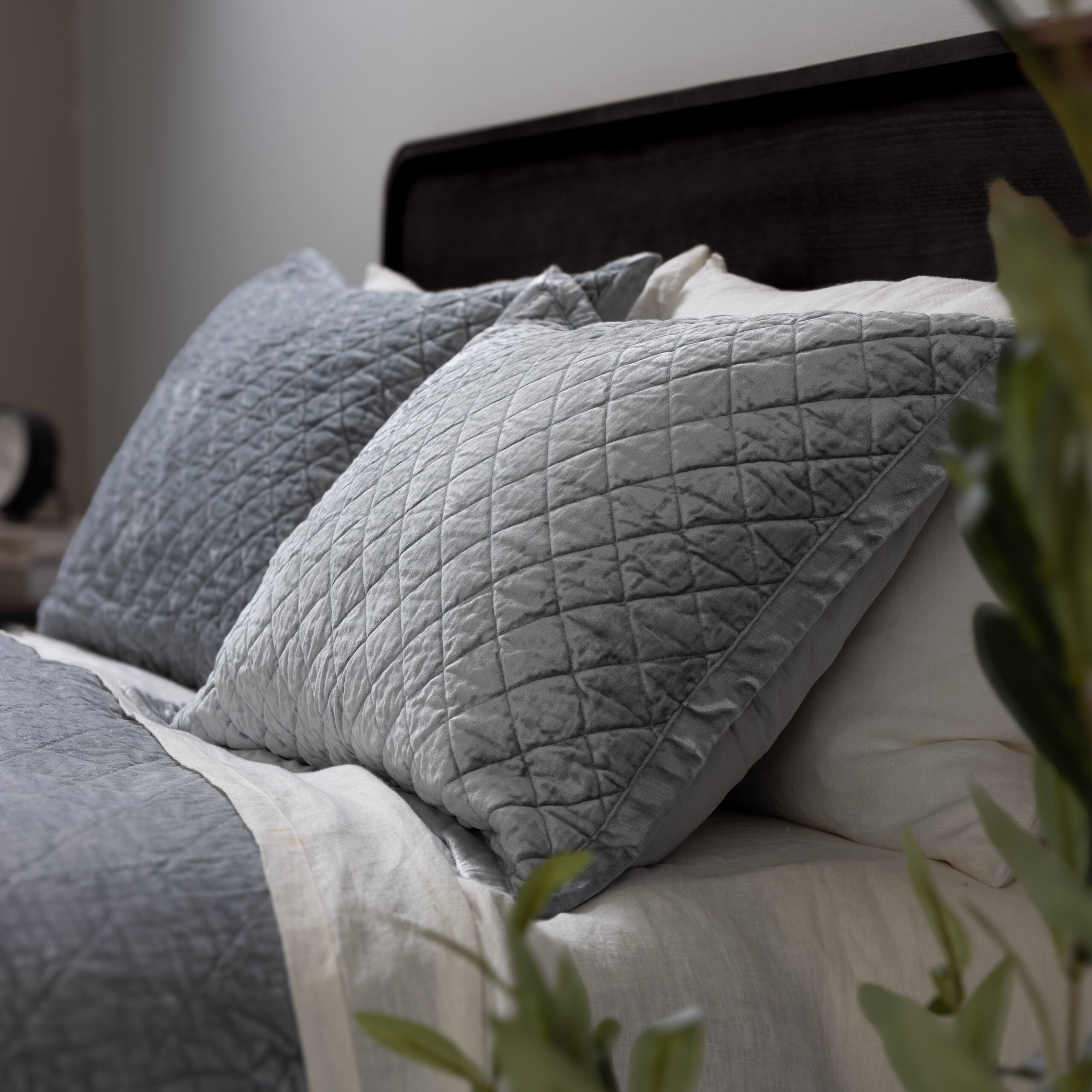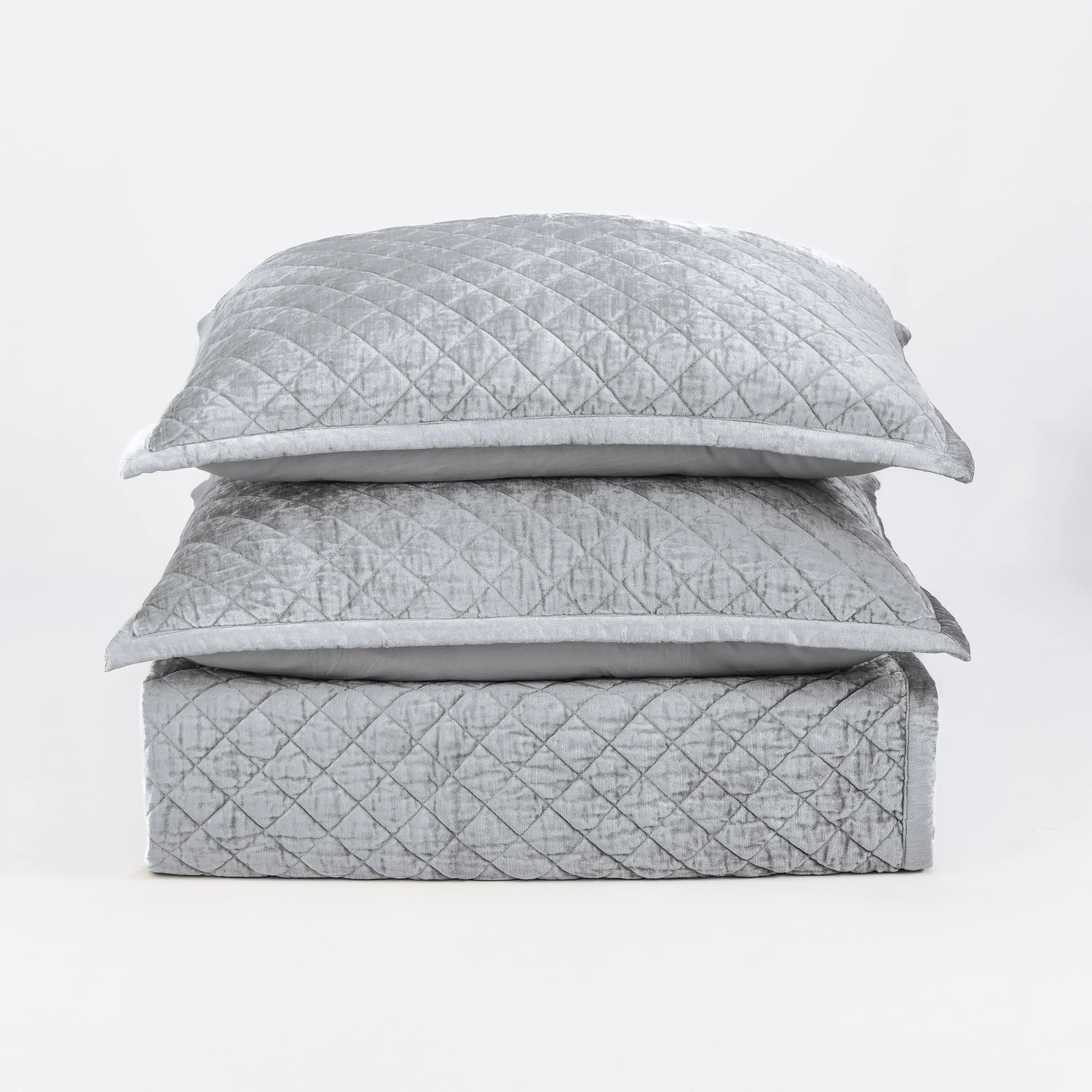 Simona is constructed of a rich rayon velvet, quilted in a classic diamond pattern and bound with self-piping for a formal and lustrous aesthetic.