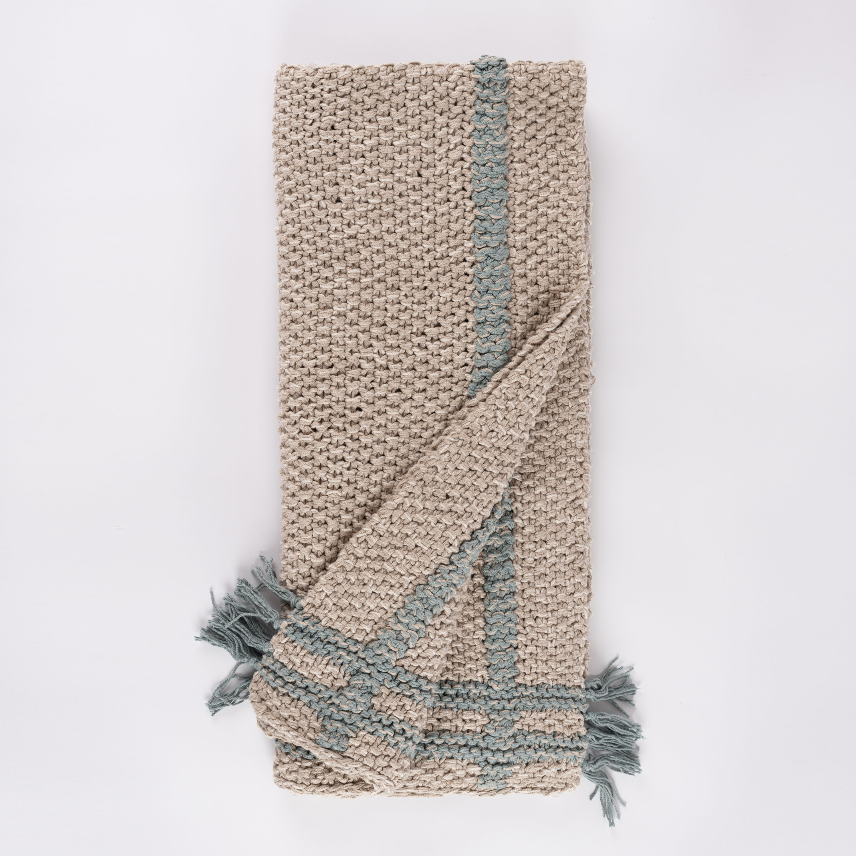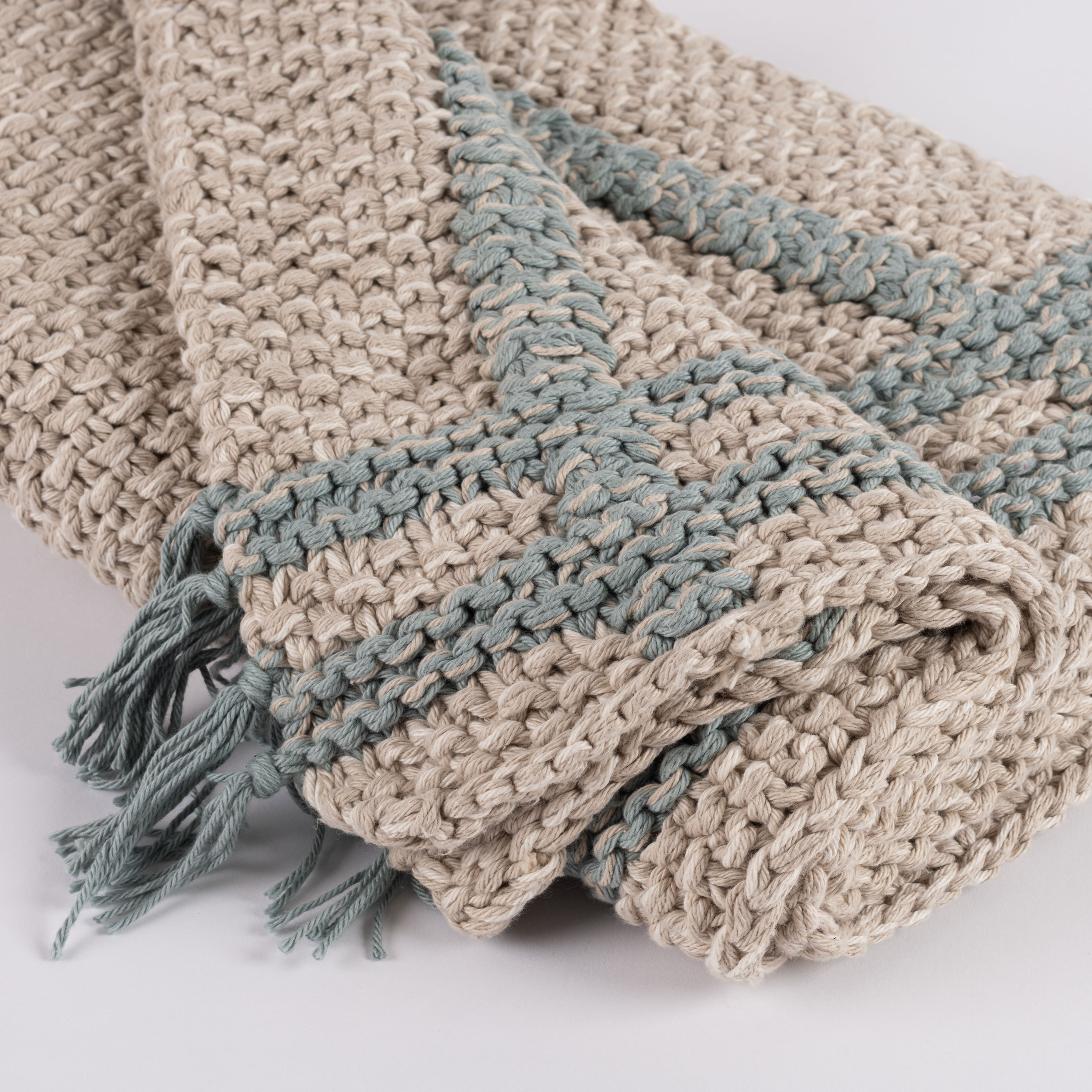 The Skye throw combines cozy charm with artisanal craftsmanship, making it the perfect accent for your space. Hand-knit from chunky cotton, it offers a plush, textured feel that invites relaxation. Its heathered warm light neutral tone is elevated by a subtle windowpane plaid design, adding a hint of structure to its soft, organic appeal. Thoughtfully finished with delicate ties at each color change, the Skye throw showcases attention to detail and a unique touch of character. Whether draped over a chair or layered on your bed, it effortlessly blends warmth and style.