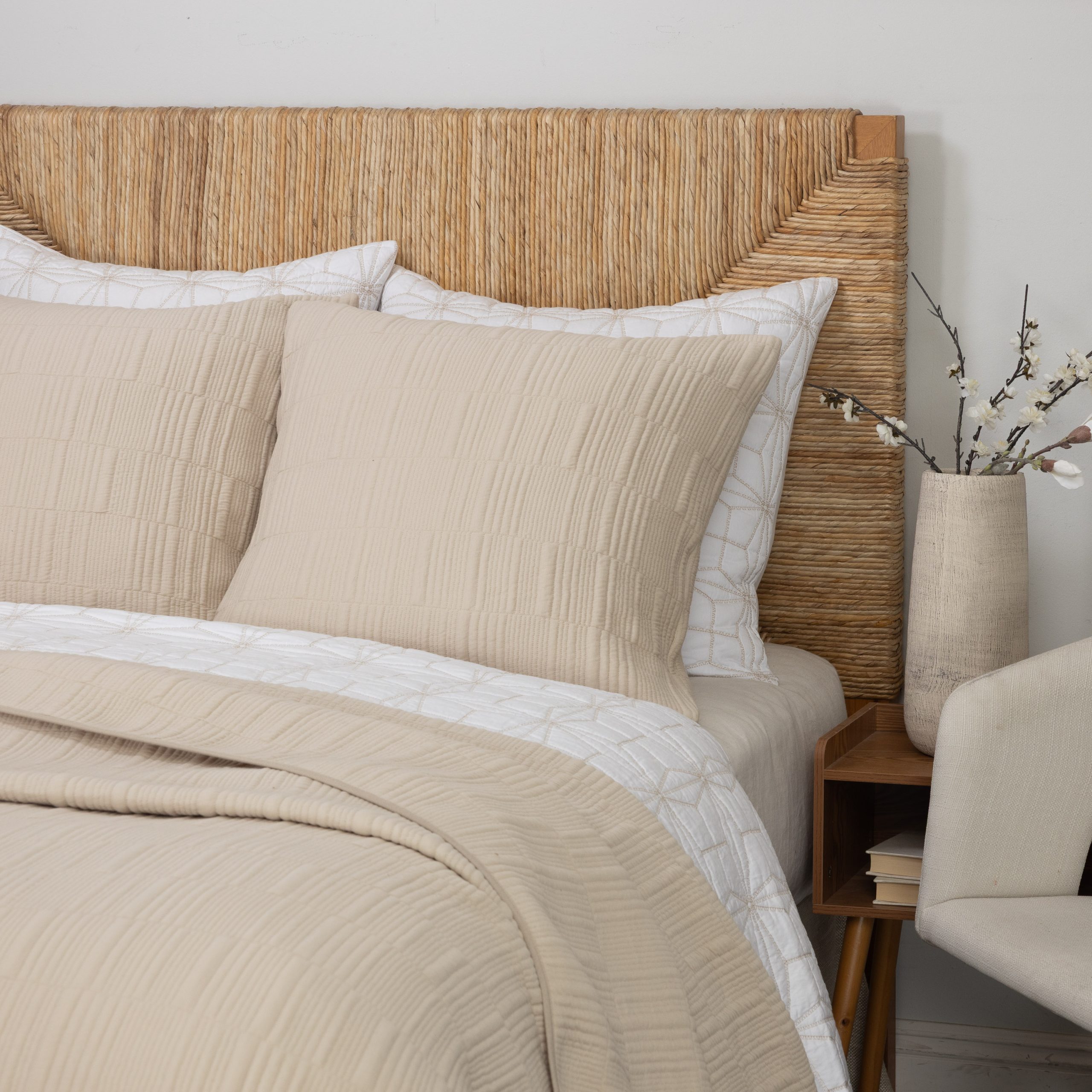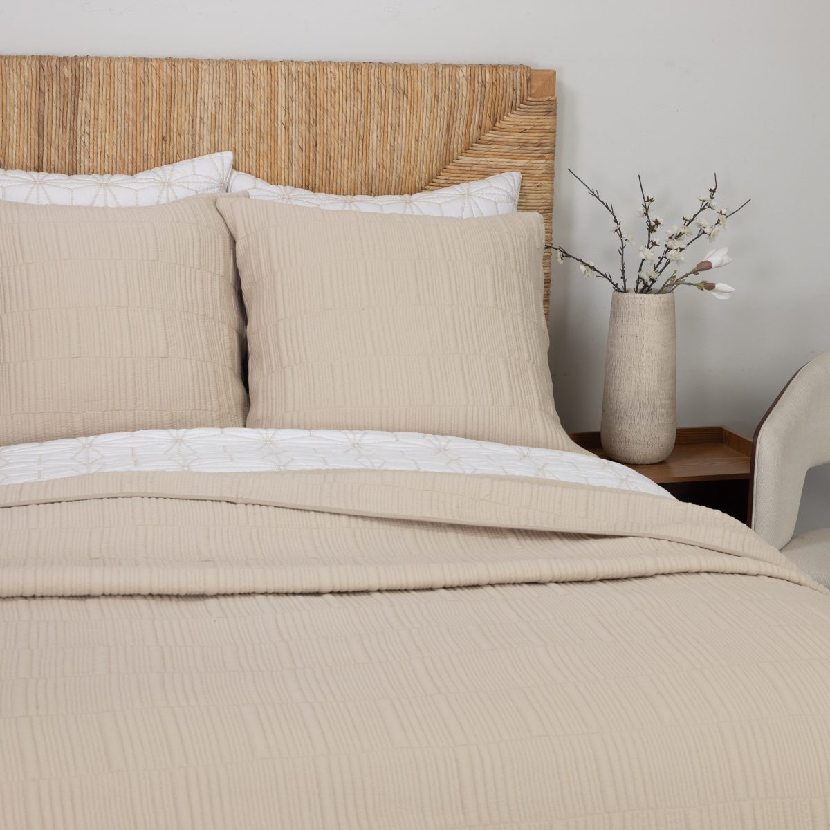 The Somaya collection is the knit blazer of bedding. Crafted from a fine cotton knit with quilting that offers a perfect balance of coziness with a tailored touch. Whether utilized as the “under it all” sleeping layer, spread neatly across the bed for polished simplicity or draped casually across the foot of the bed, it effortlessly combines comfort with versatility.
