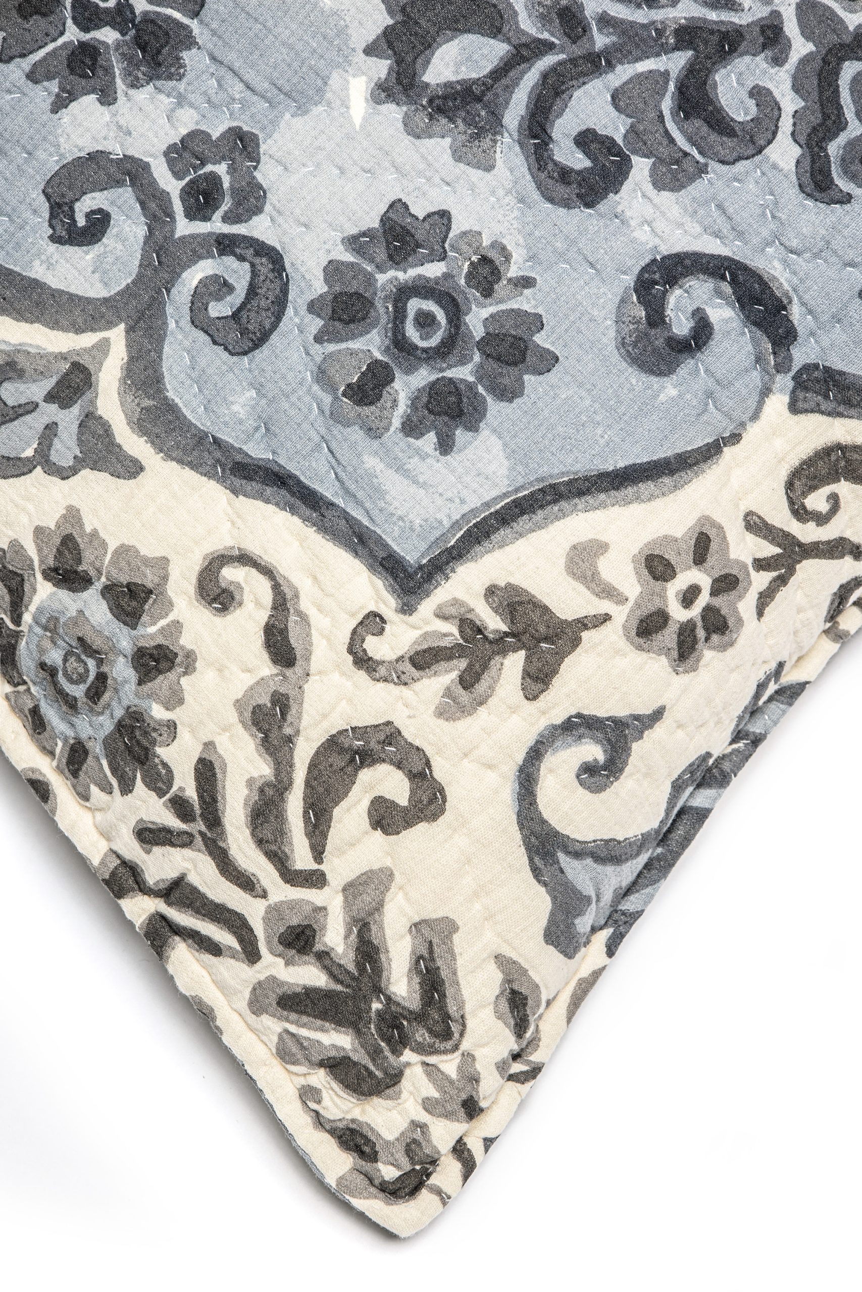 Inspired by historical, large scale frame motifs the Sophia quilt has an heir of tradition, yet fresh in presentation. The drawing itself has a gestural watercolor effect and is printed on a gauzy cotton ground for a slightly casual aesthetic.