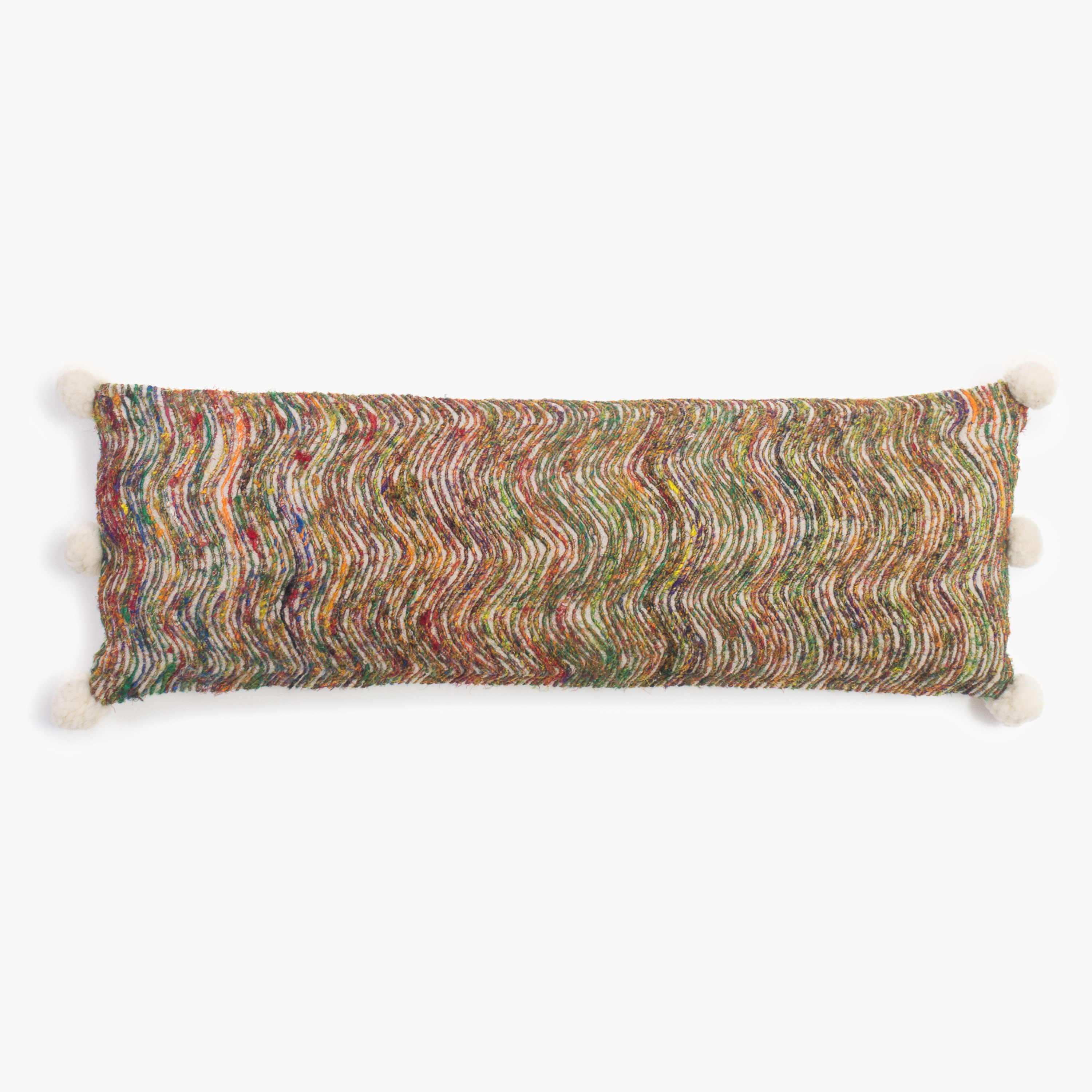 A celebration of color and craftsmanship, this luxurious bolster pillow features an intricately woven chevron pattern using multicolored yarns for a rich, painterly effect. The tactile surface shimmers with depth and dimension, while plush ivory pom tassels on each corner lend a playful yet elevated finish. Bold yet refined, it’s a statement piece designed to enliven any sophisticated setting.