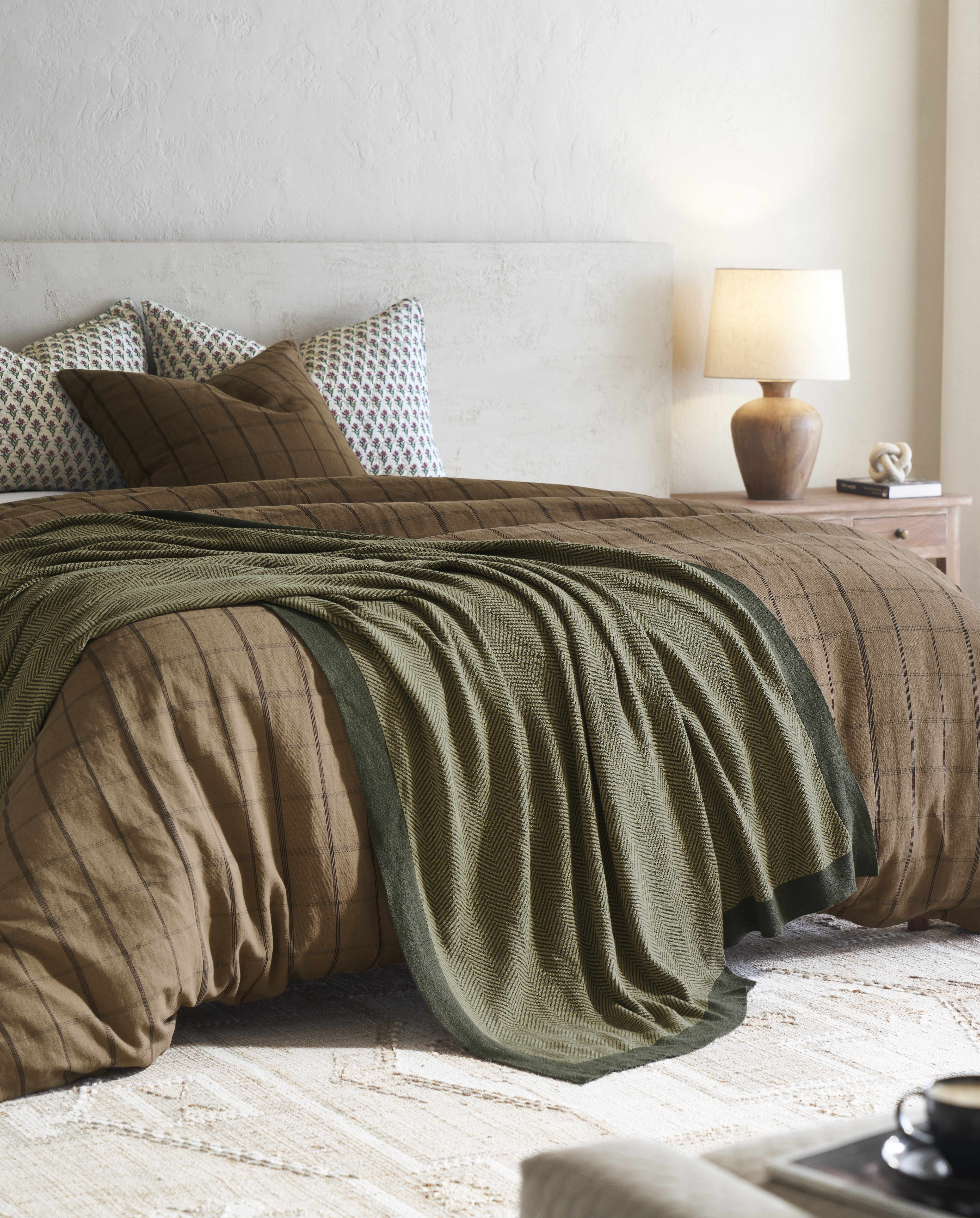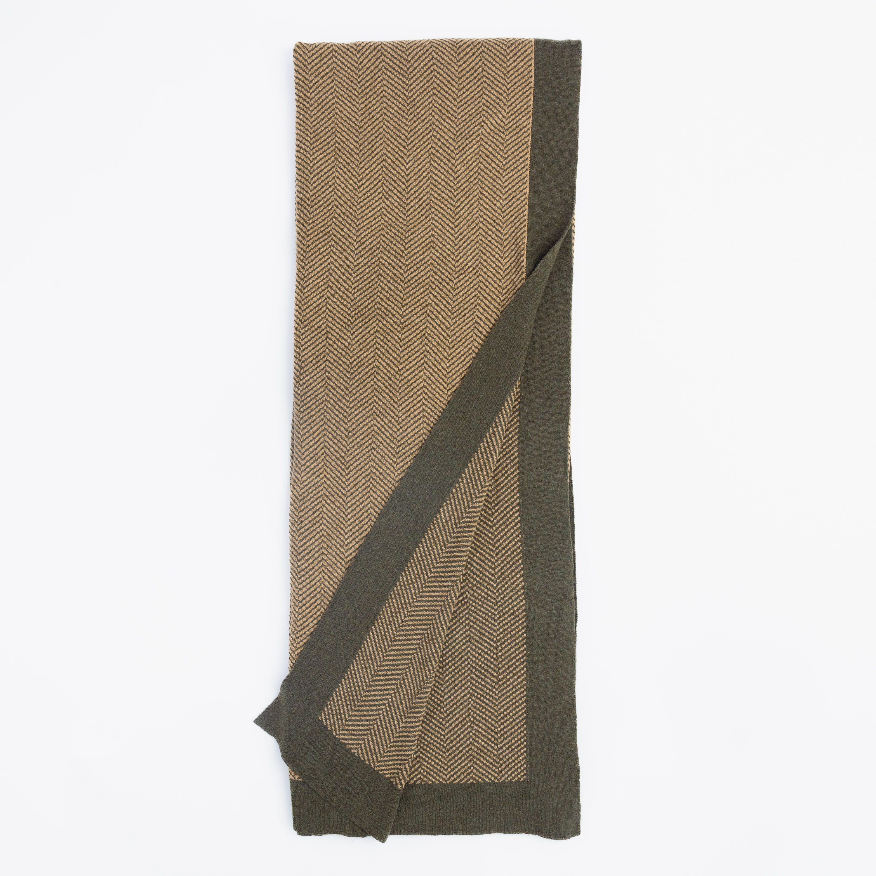 Sweeney is a fine cotton knit in a herringbone pattern, finished with a solid-color border. This generous throw fits neatly across a king-size bed. Its refined fiber and finish give it a timeless look with a subtly modern edge.Â