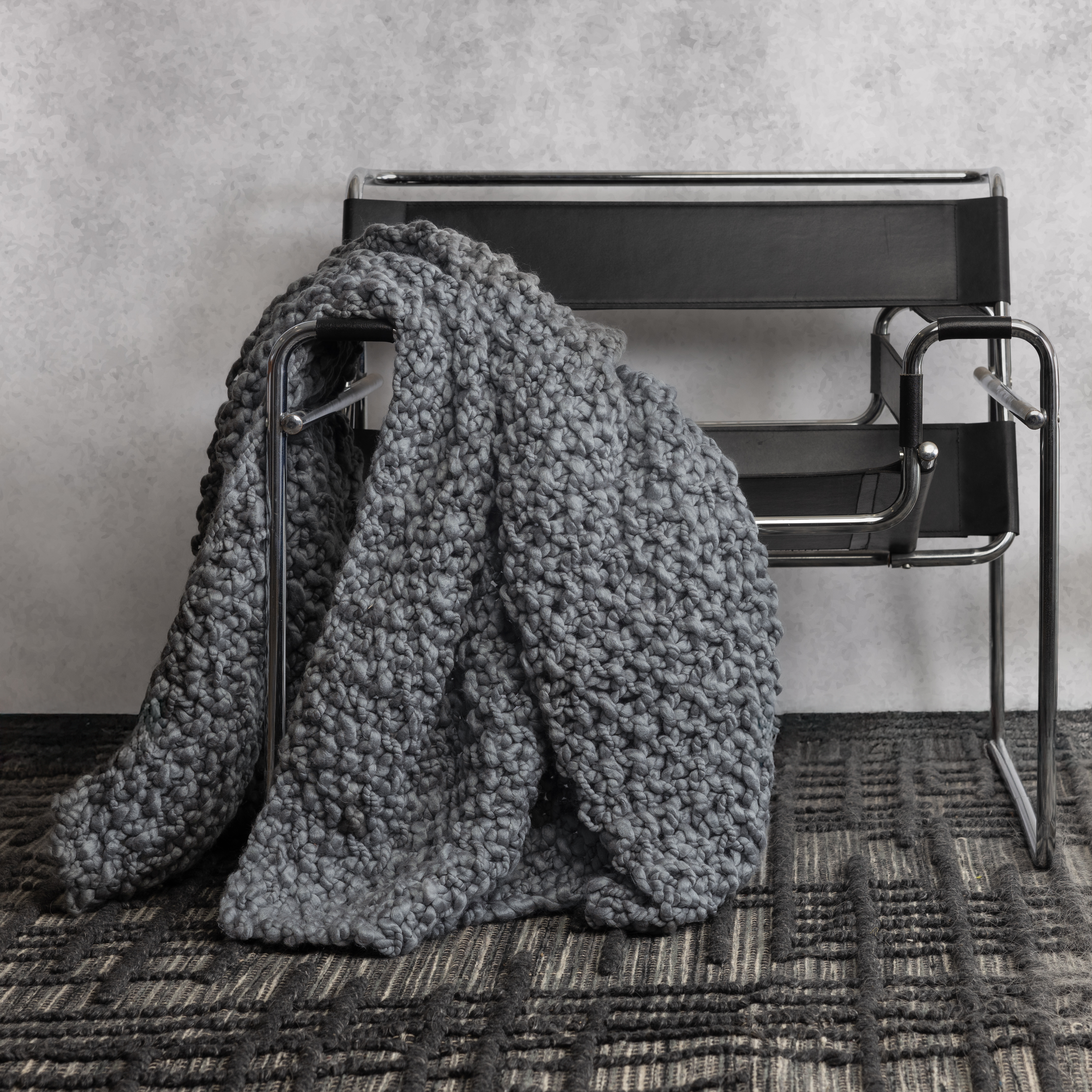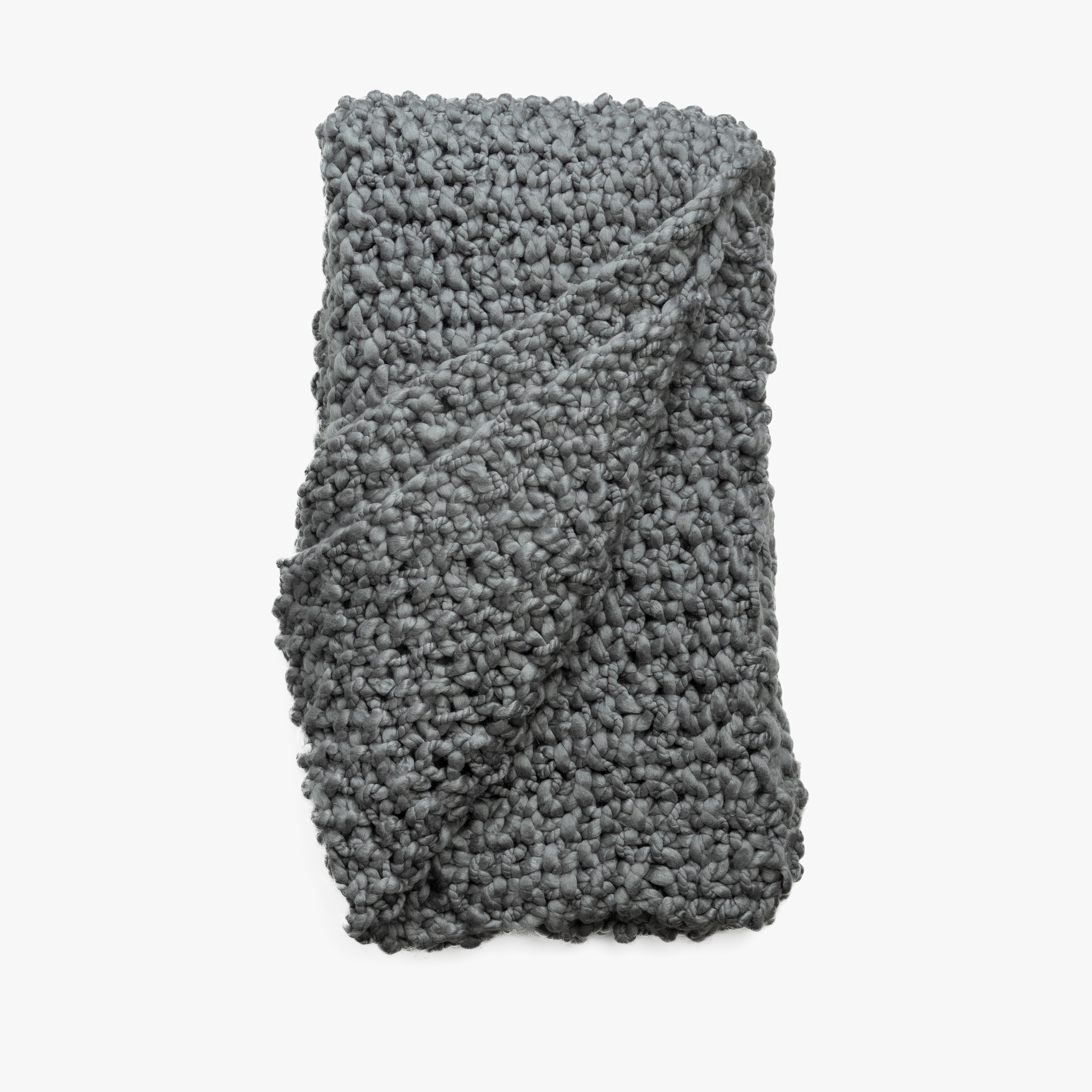 Knit of an irregular, thick and thin yarn gives this throw its unique texture and soft hand.