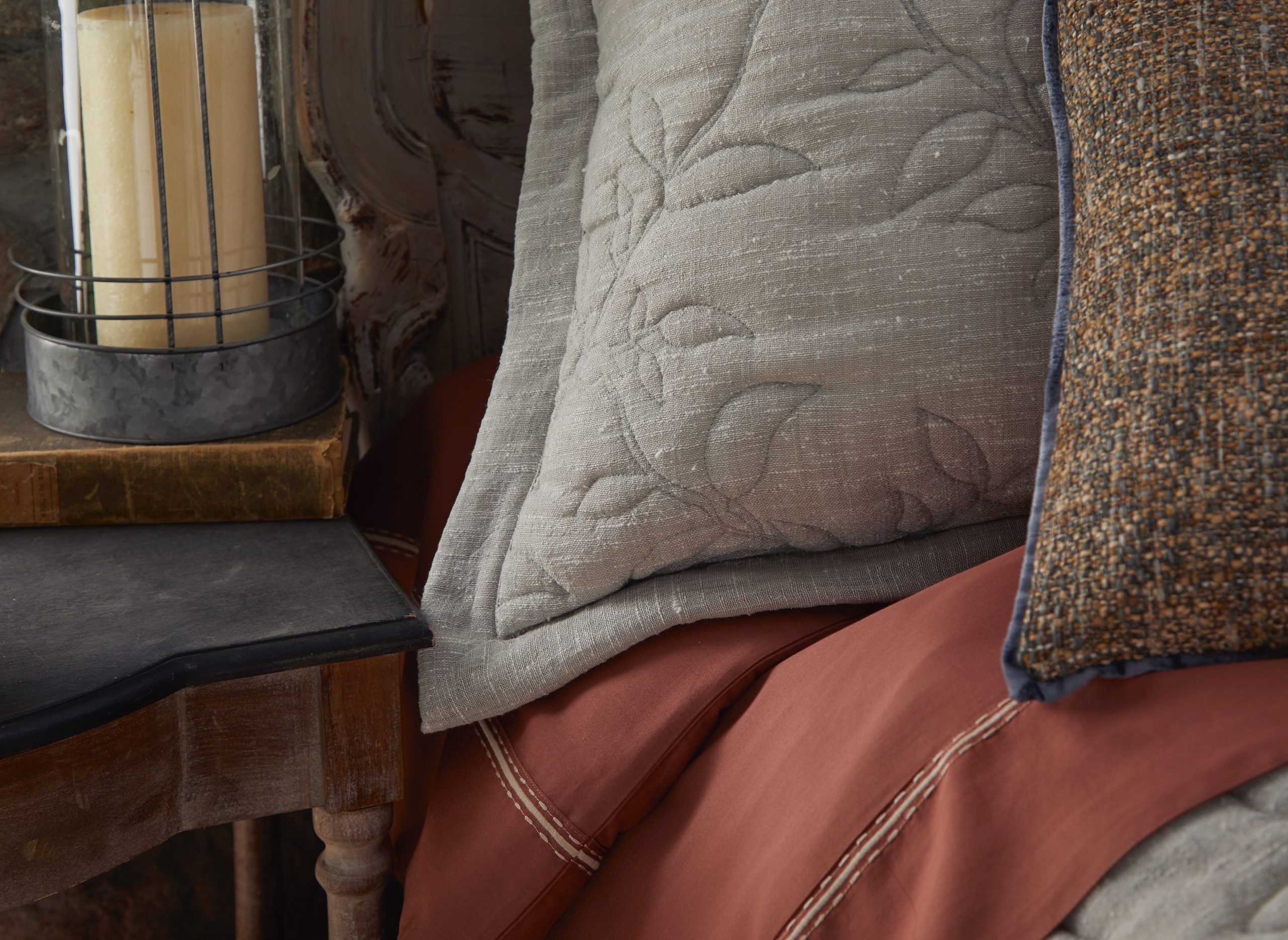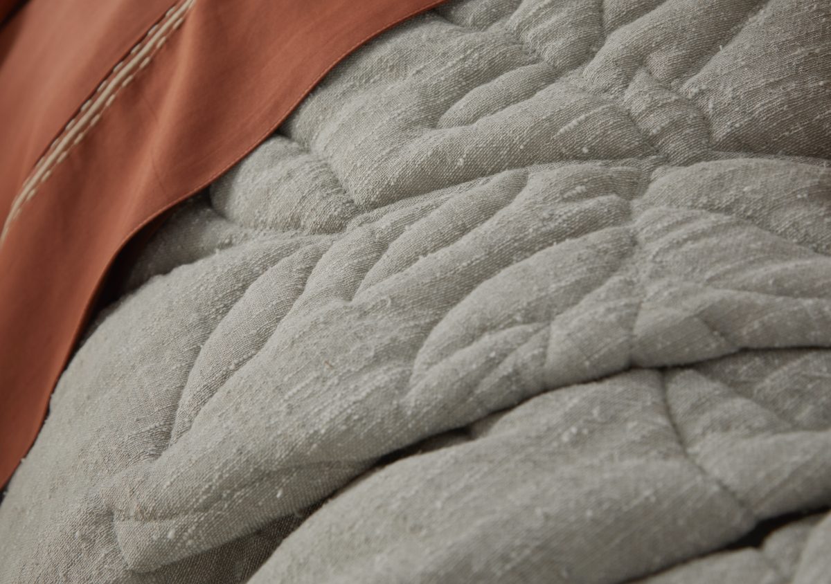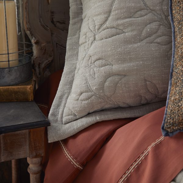 Made from recycled cotton designed to mimic the refined texture of raw silk, Tessa carries a thoughtful eco story. Its large-scale diamond-vine quilting blends timeless charm with playful whimsy, while a lofty fill enhances the piece with inviting puff and texture. A mitered-edge flange completes the look.