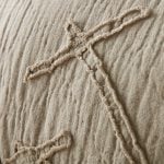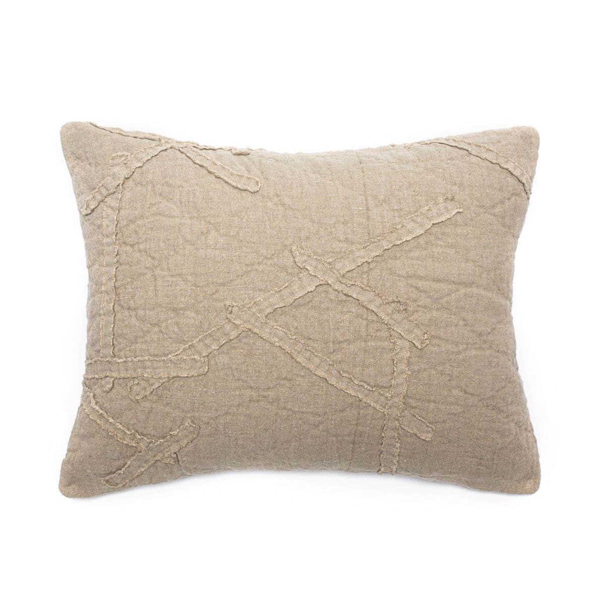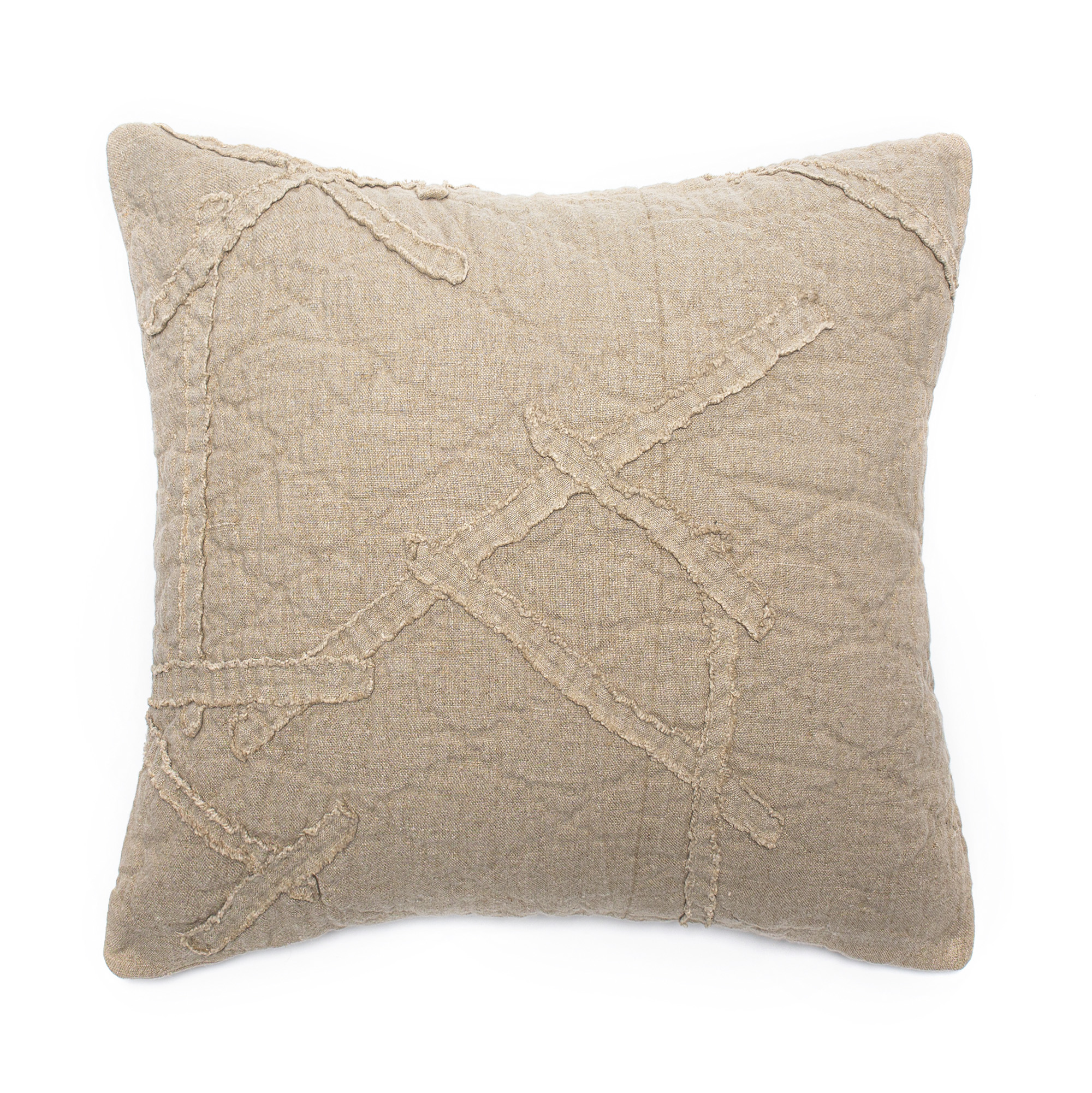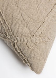 Teton is constructed of a rich slubby linen that is enzyme washed to further open the fiber for a vintage linen effect. An irregular geometric pattern is appliquéd on top and left with raw eyelash edges for a modern artisanal sensibility.