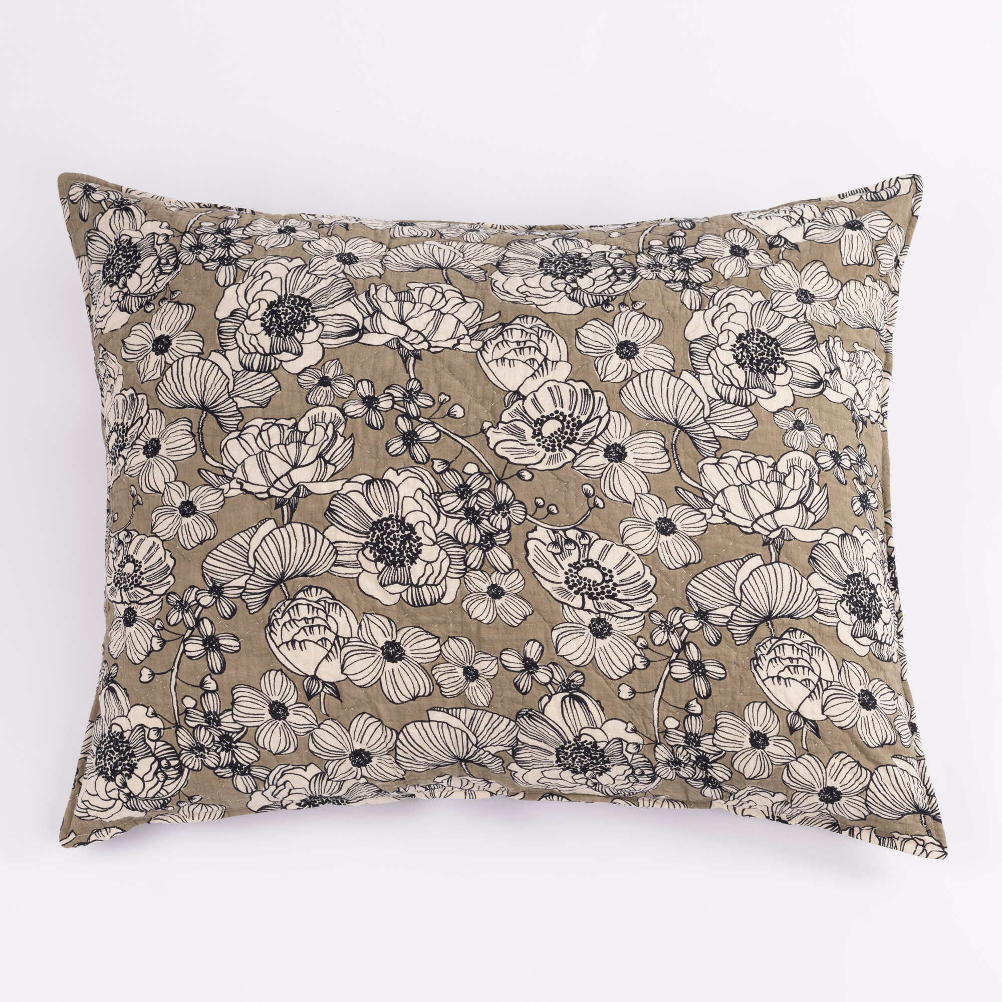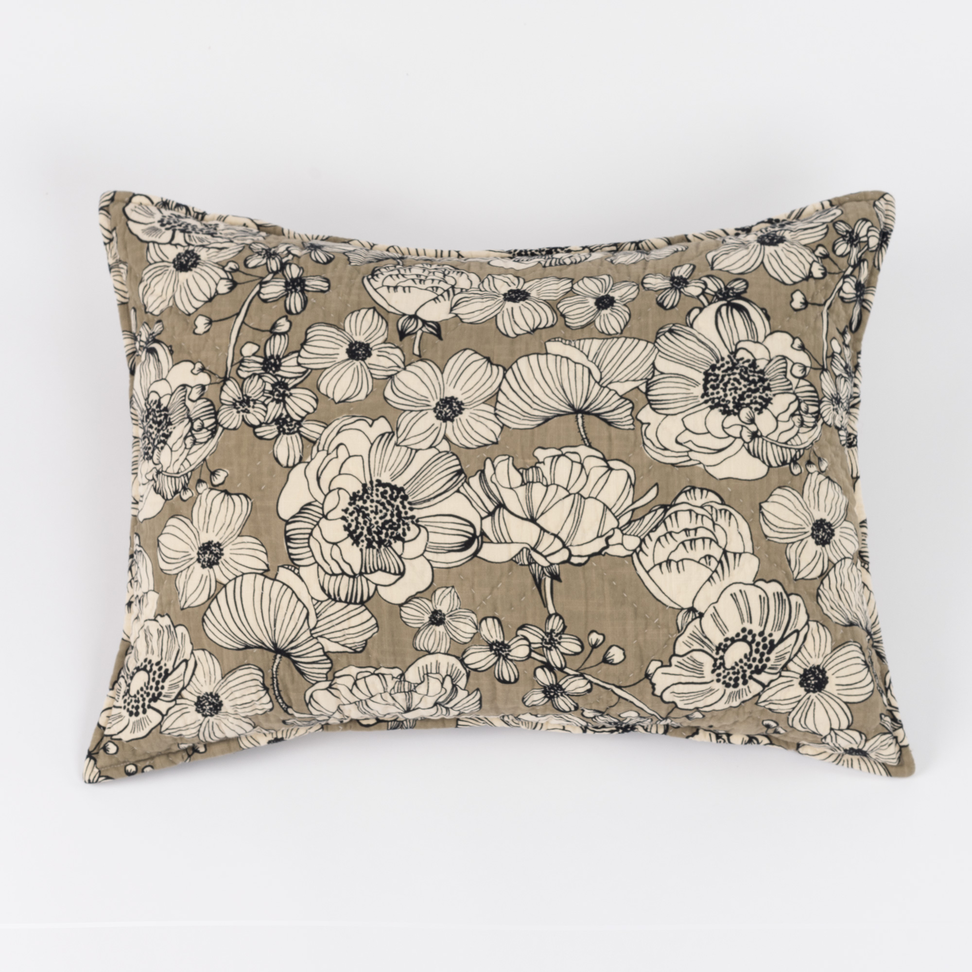 A lovely juxtaposition, the Tinsley showcases the natural cotton ground as the floral pattern with a striking black outline and set against a boldly colored background. Printed on 100% cotton with a soft hand, then hand quilted this collection has both drama and a casual ease that could handle the spotlight or act as accent.