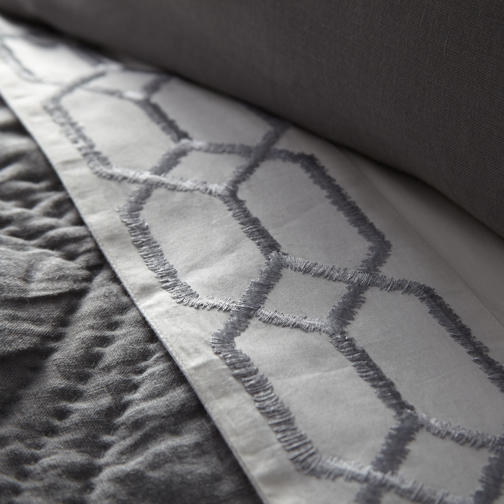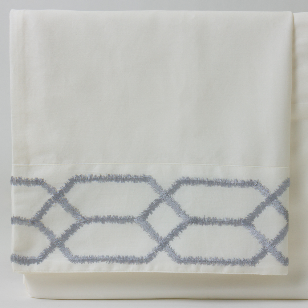 A luxurious blend of cotton and modal for a supremely soft hand and added moisture wicking properties. The lead edge is embroidered with a wrought iron inspired motif that is both classic and modern.
