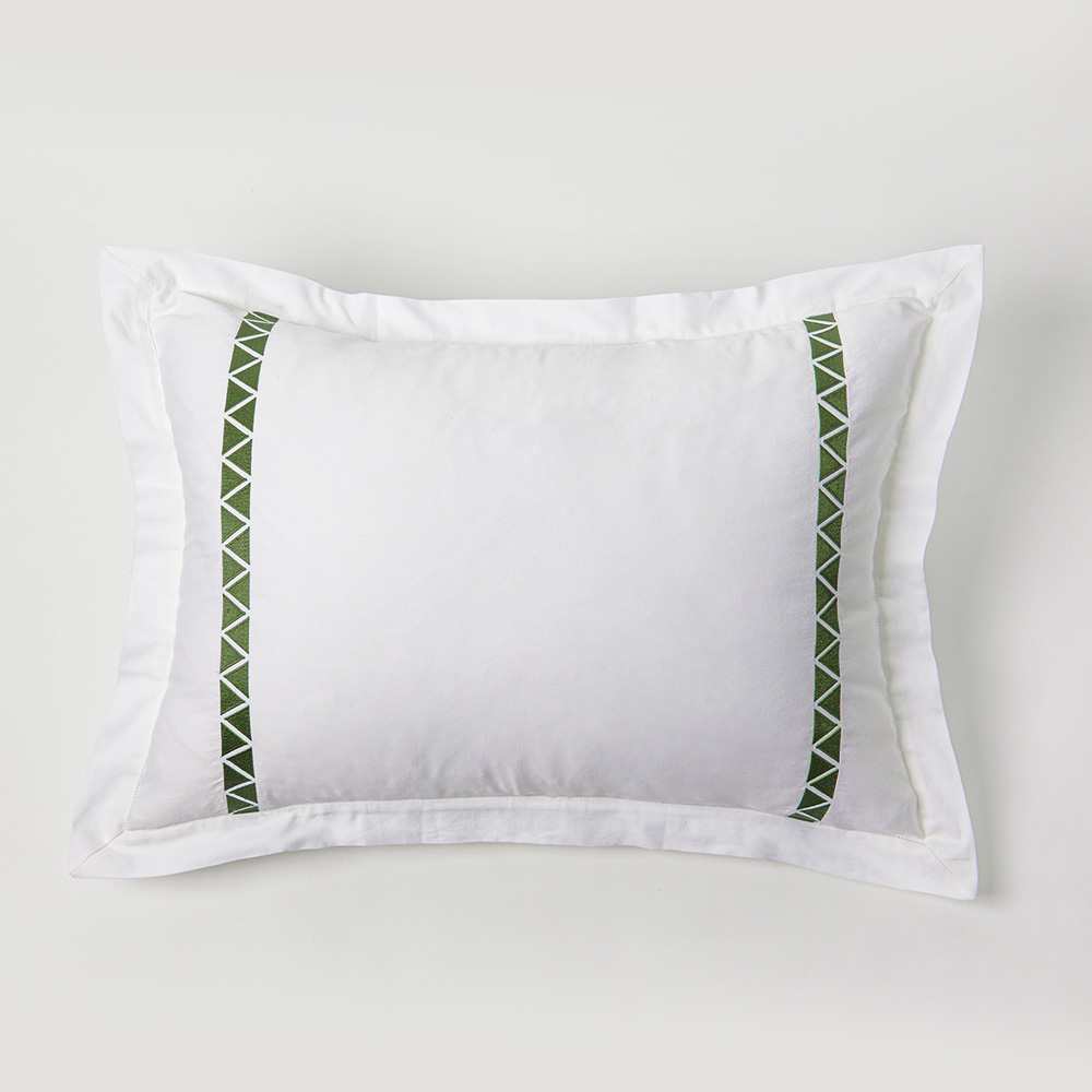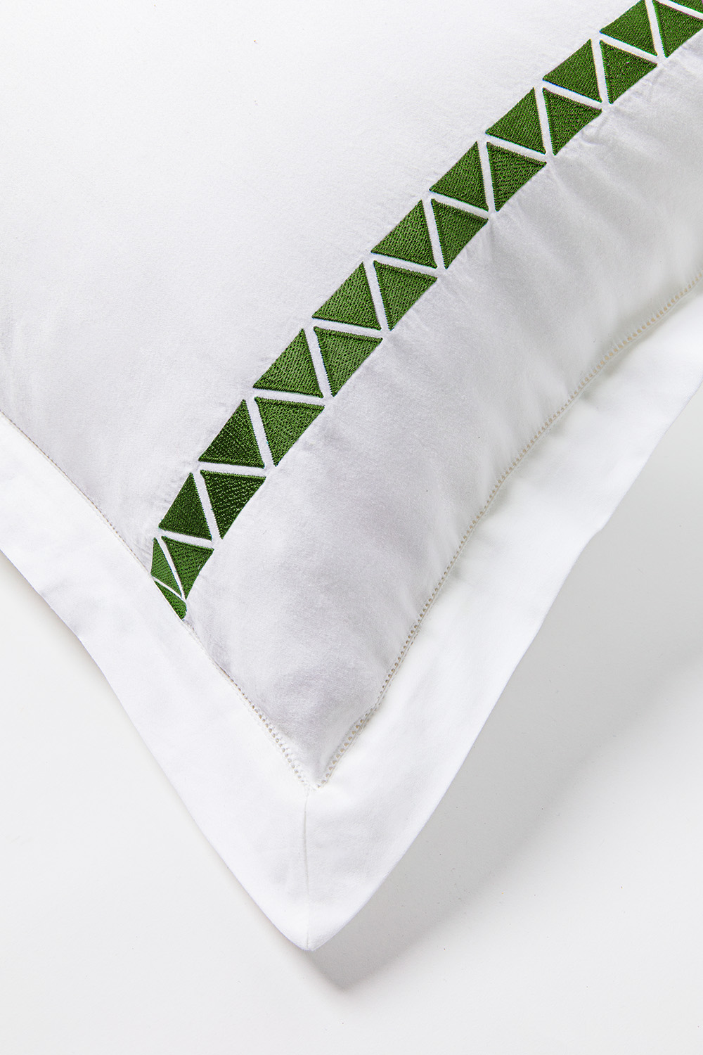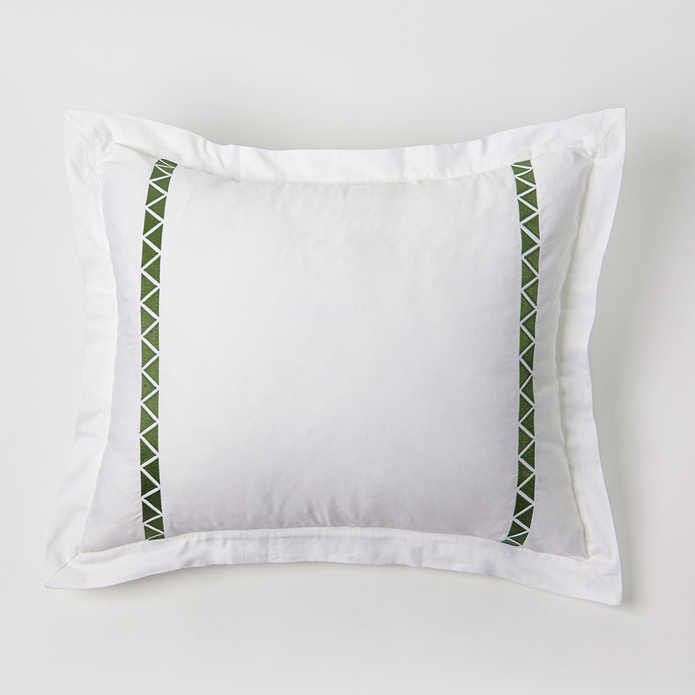 Crisp 400 thread count cotton sateen sheeting, embroidered with off-set facing triangles, in bold hues for a chic style.