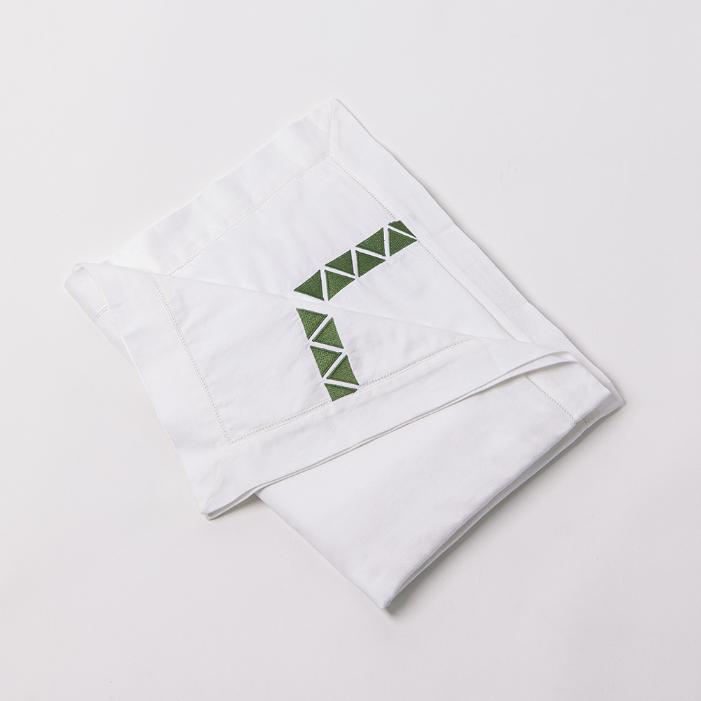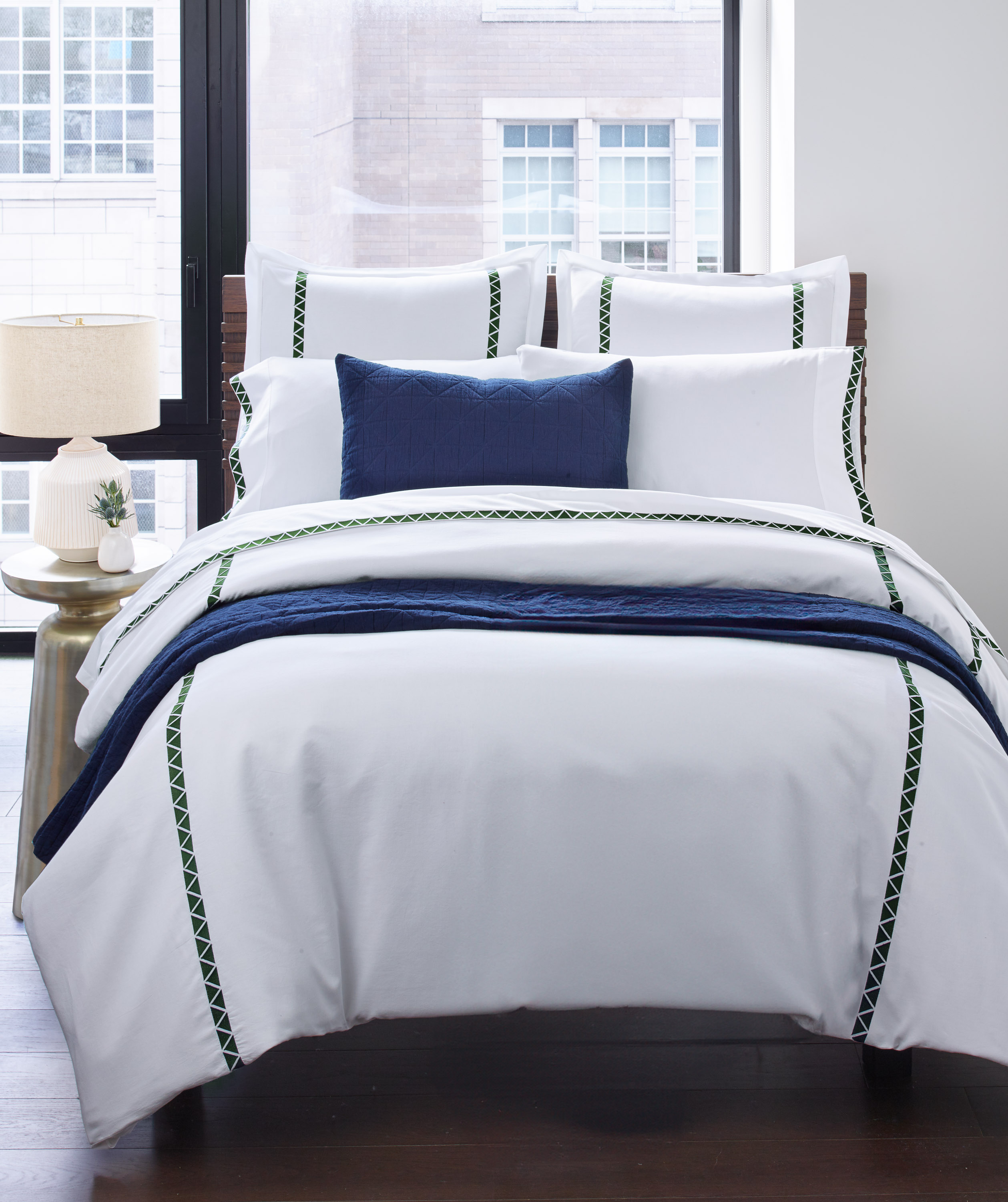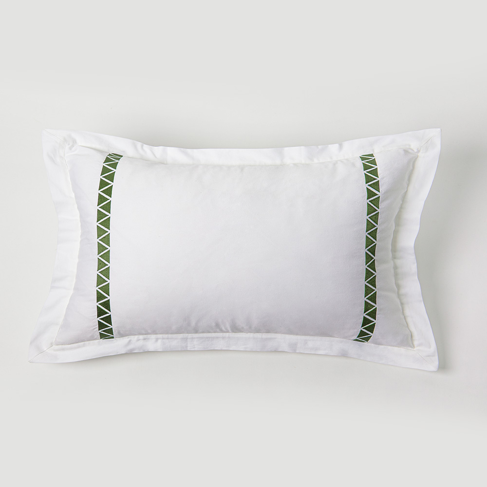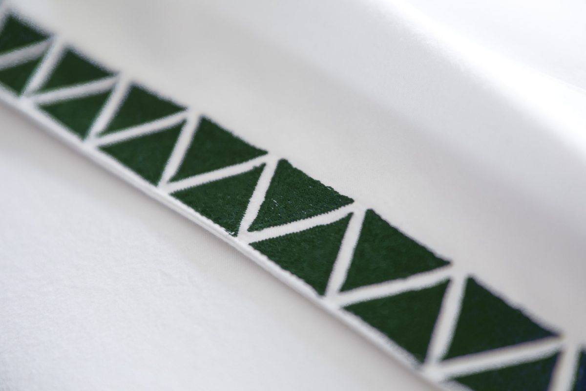 Crisp 400 thread count cotton sateen sheeting, embroidered with off-set facing triangles, in bold hues for a chic style.