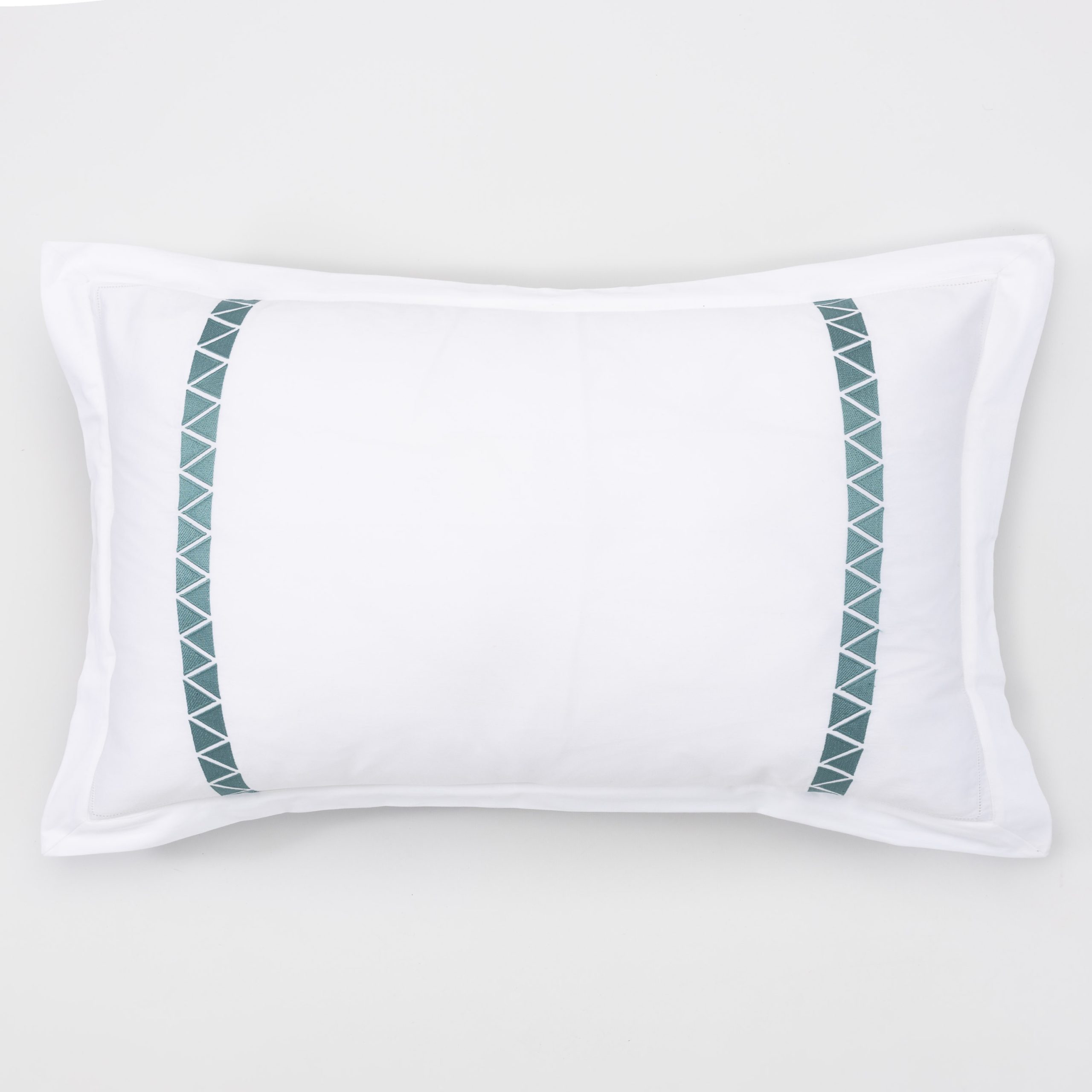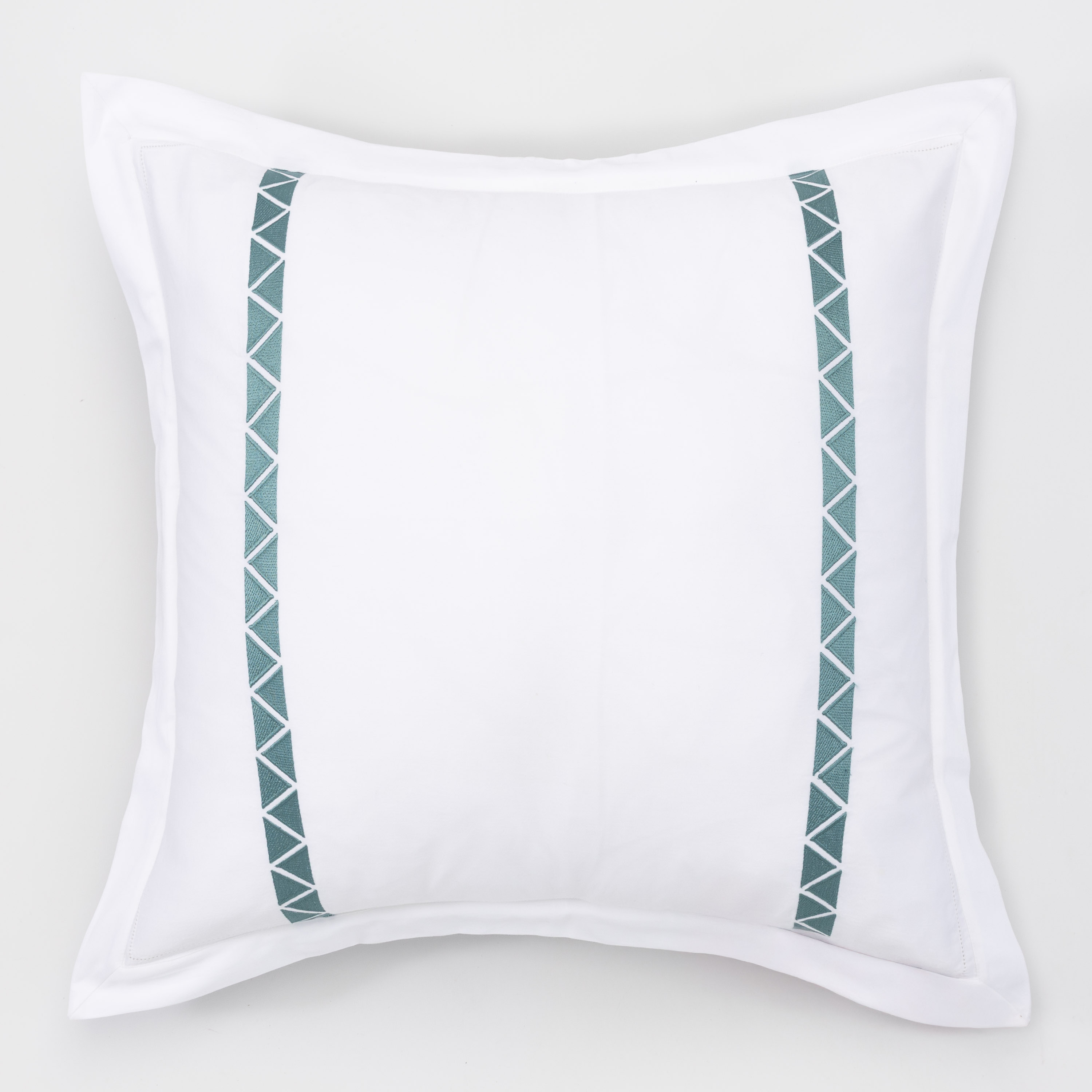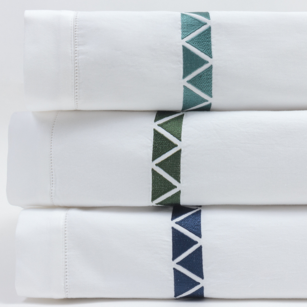 Crisp 400 thread count cotton sateen sheeting, embroidered with off-set facing triangles, in bold hues for a chic style.