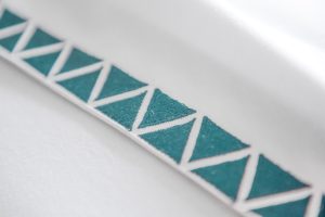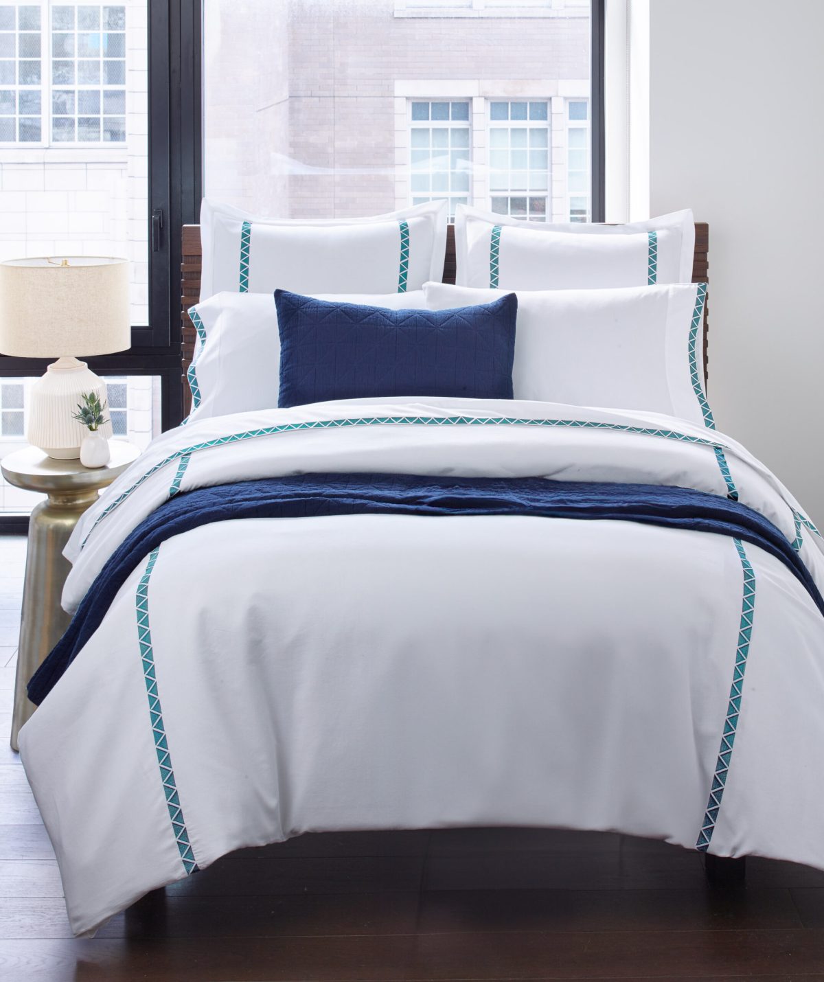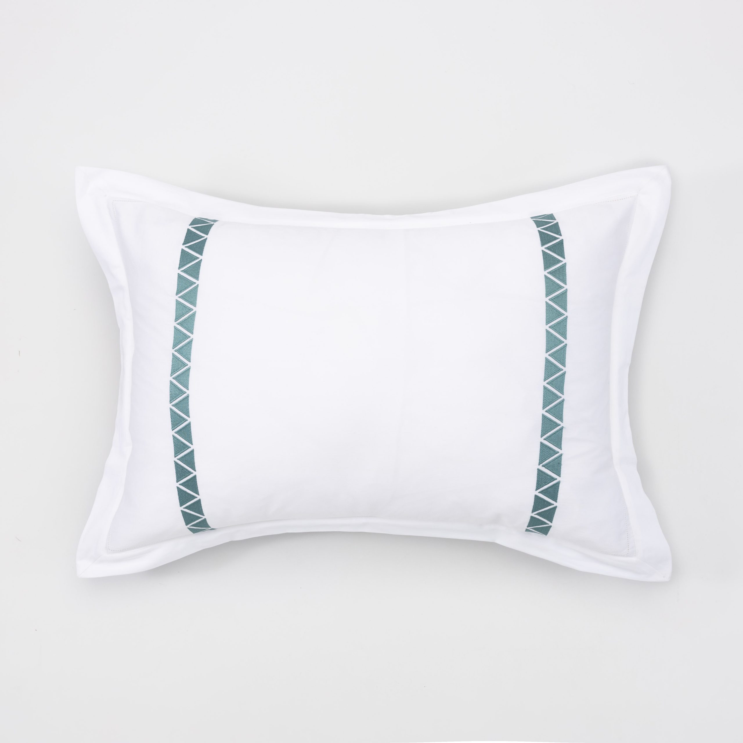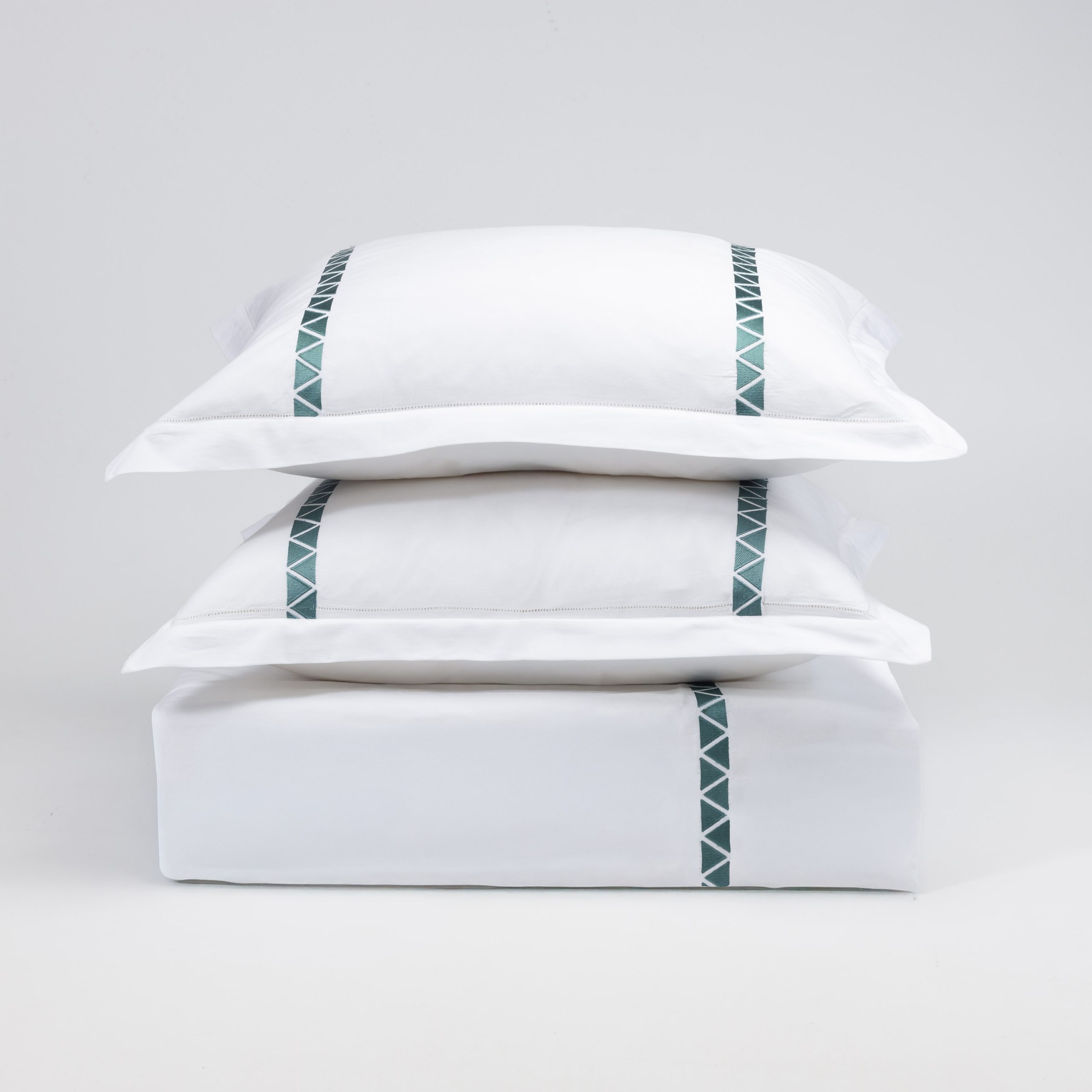 Crisp 400 thread count cotton sateen sheeting, embroidered with off-set facing triangles, in bold hues for a chic style.