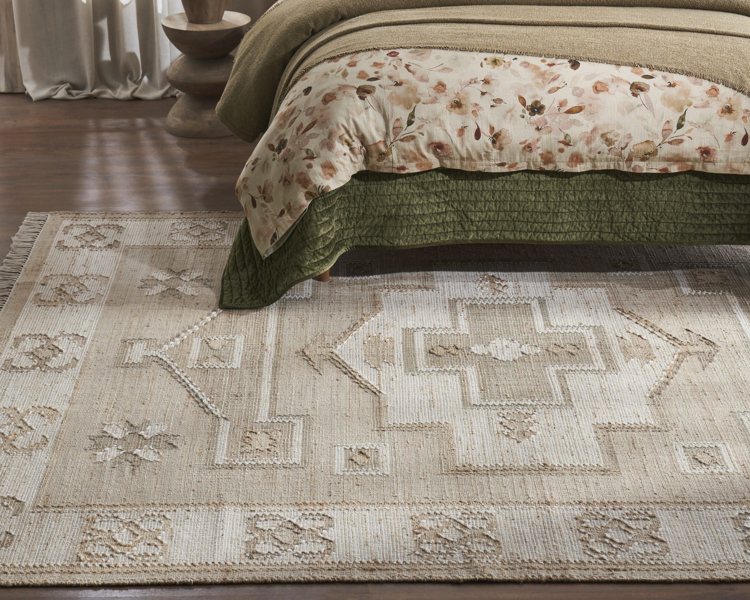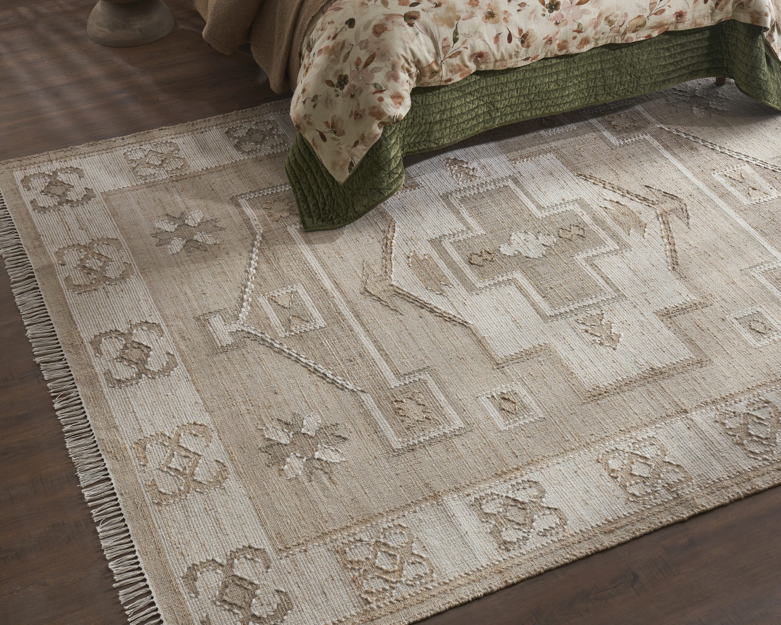 This handwoven rug is a rich tapestry of texture and tradition, crafted from a blend of jute, wool, and cotton for a grounded, natural feel. At its center, a large-scale medallion commands attention, framed by a detailed border of smaller motifs that add rhythm and refinement. The mix of fibers brings depth and durability, while hand-tied tassels finish the piece with an artisanal touch. Both bold and balanced, this rug makes a timeless statement—anchoring the room with warmth, texture, and handcrafted character.