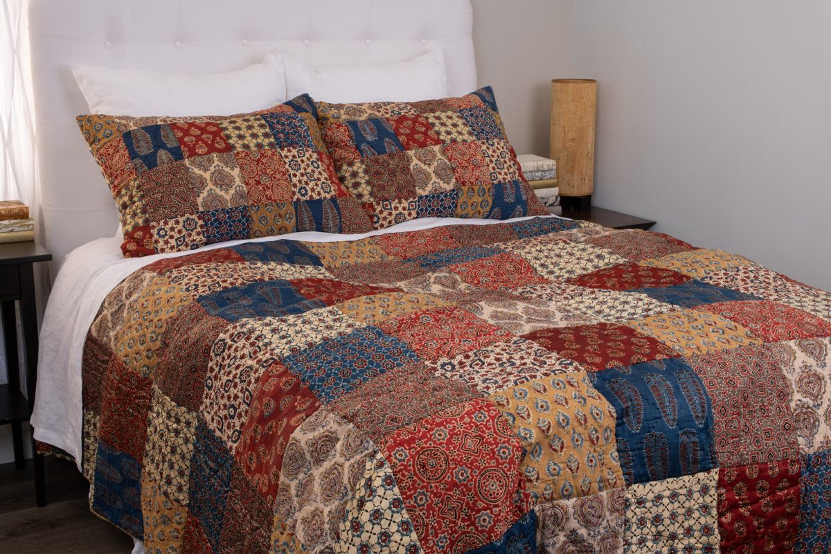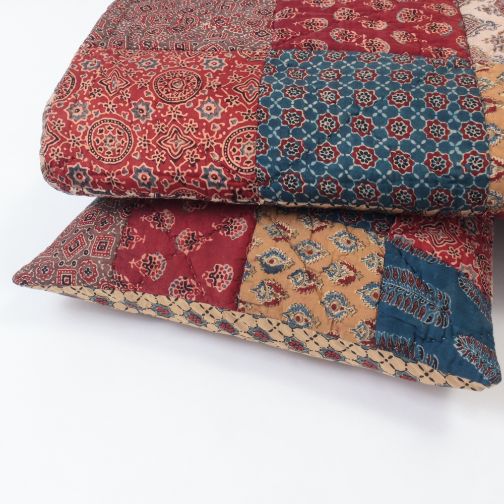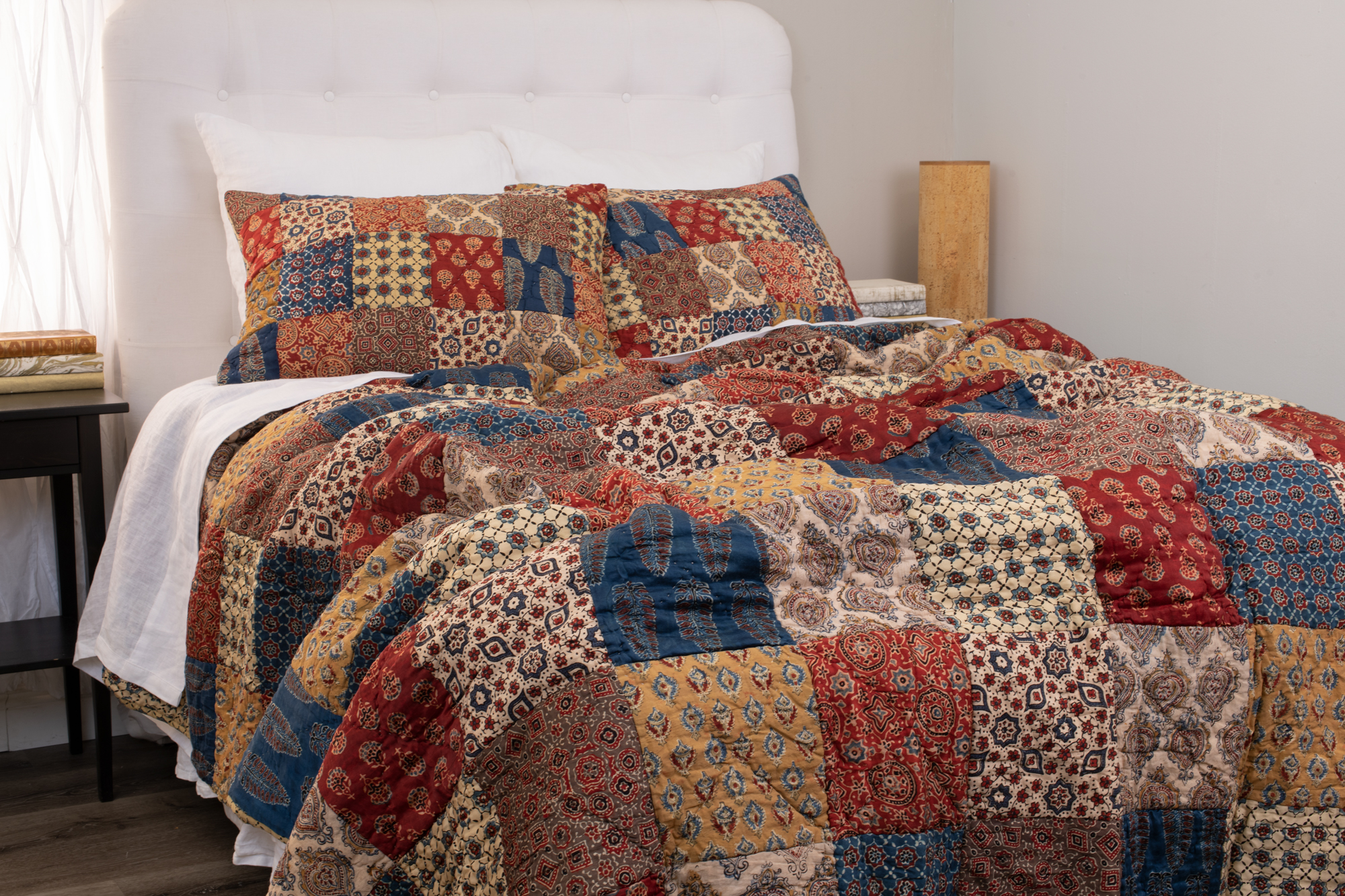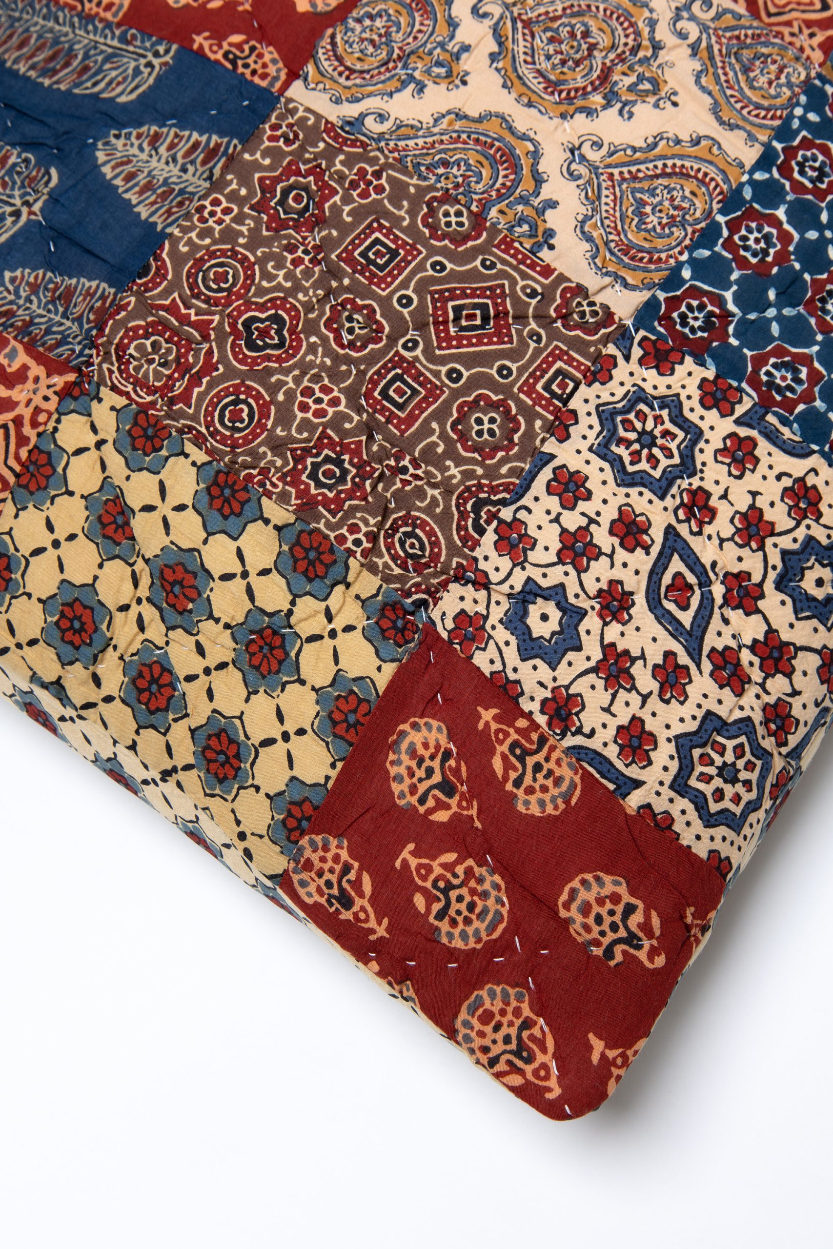 This Bohemian patchwork quilt is made up of a kaleidoscope of Jaipuri block print inspired patterns in a mix of fine cotton and lustrous rayon.