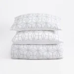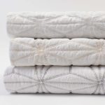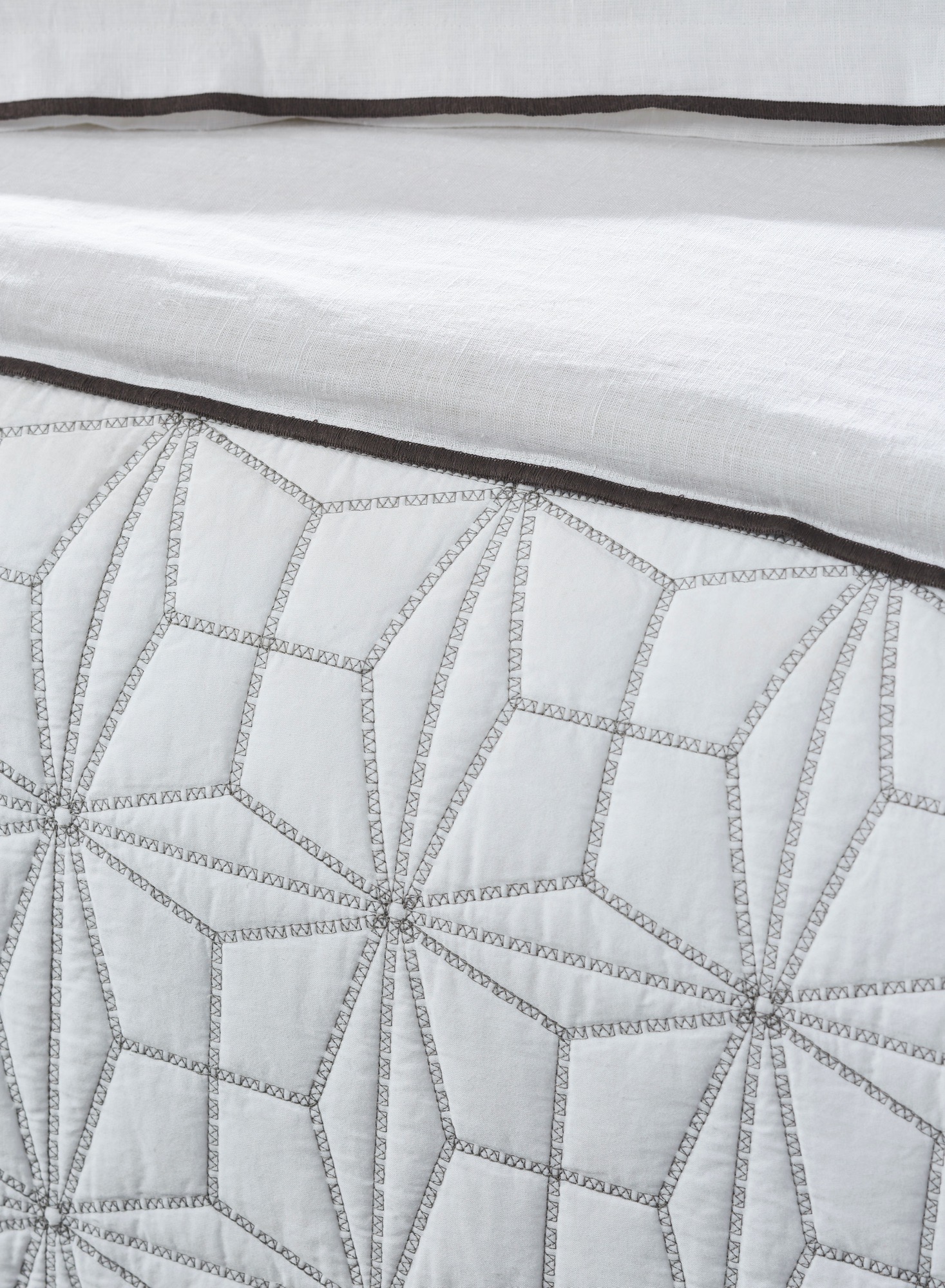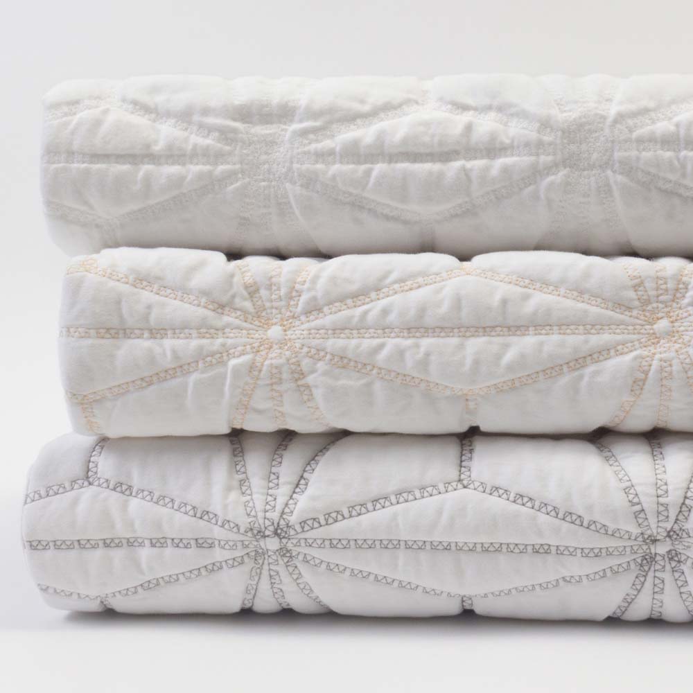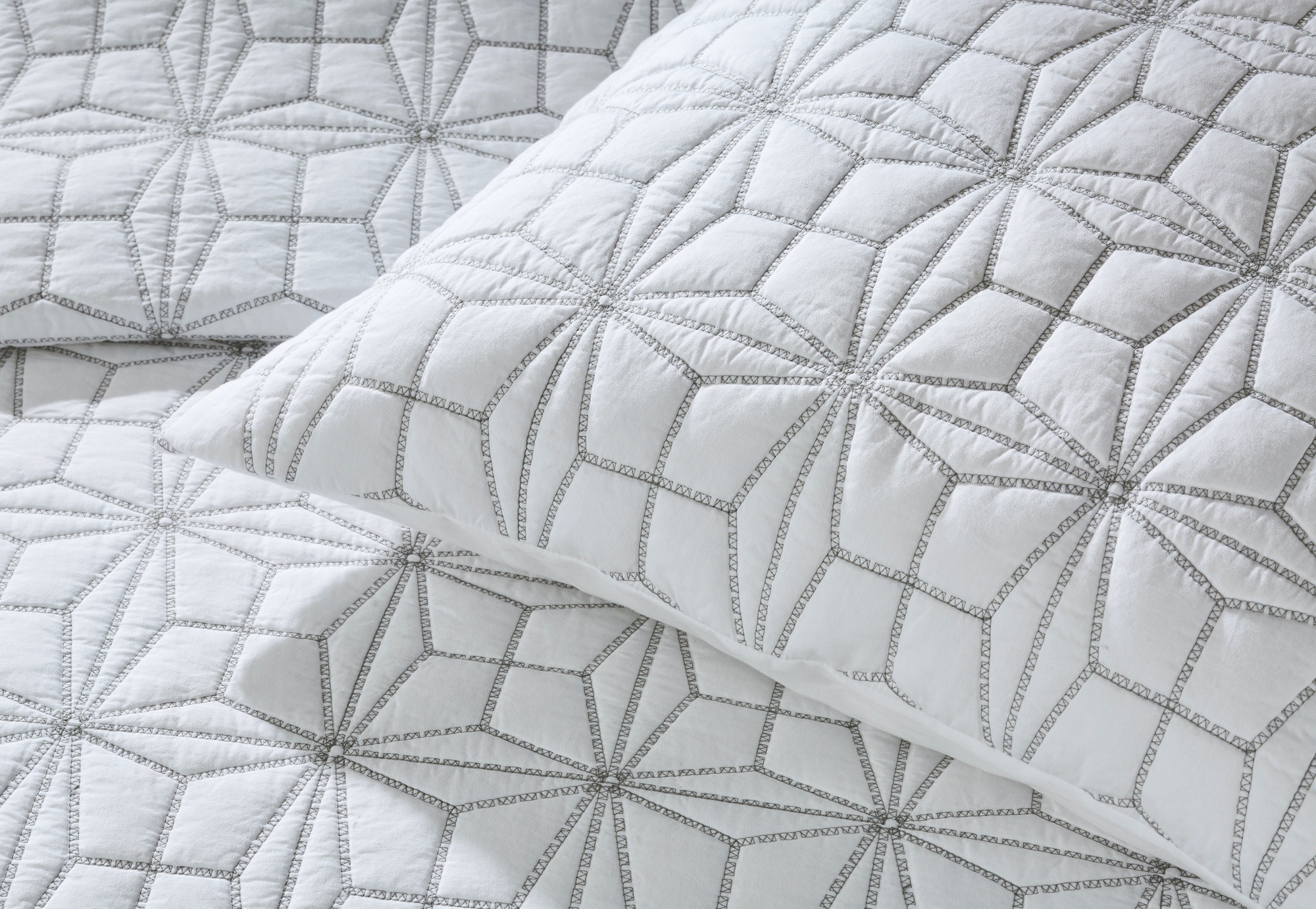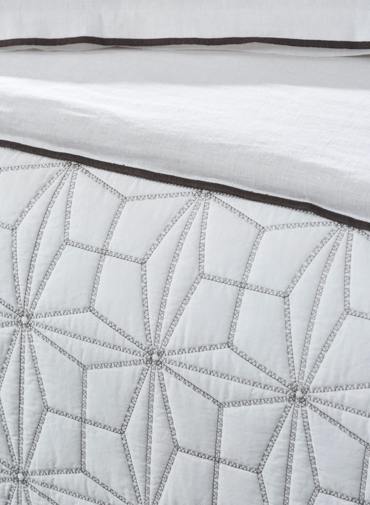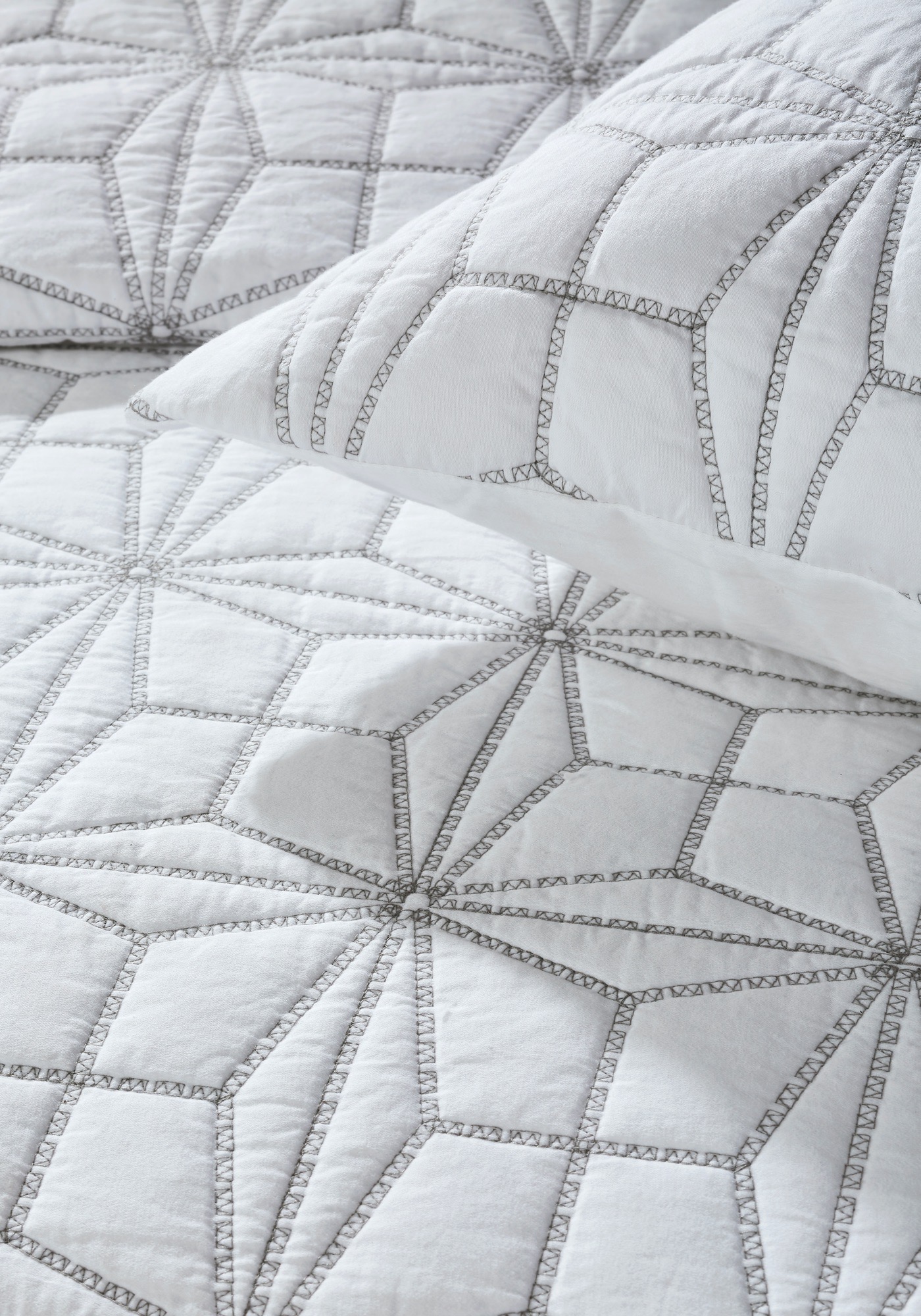 A graphic star pattern is embroidery quilted on a 400 thread count cotton sateen sheeting ground, for a sleek style with subtle pattern and texture.