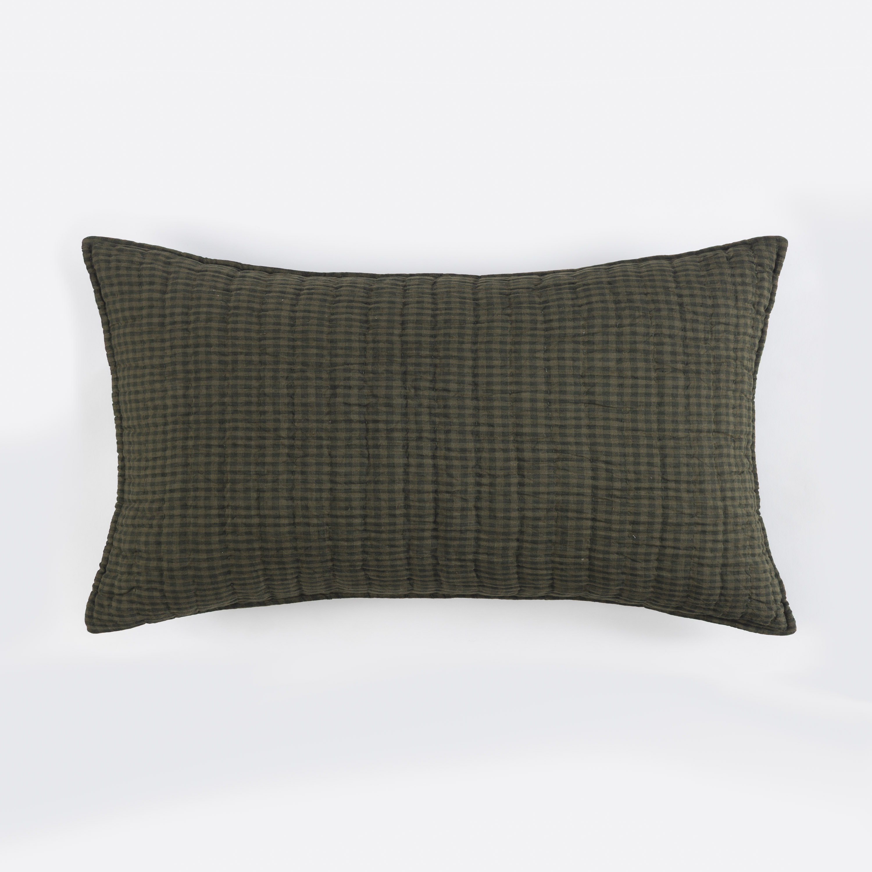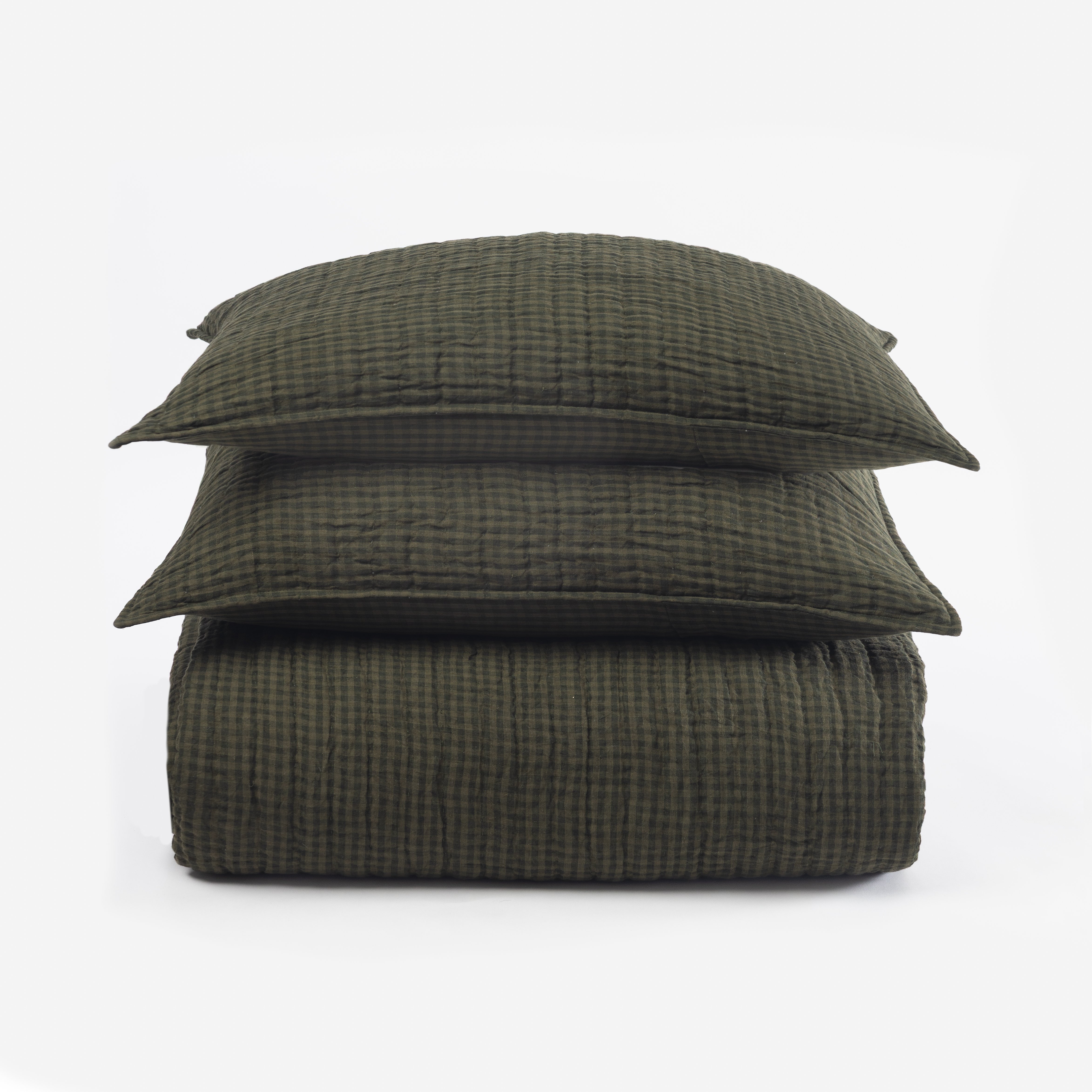 This cypress green quilt reimagines classic gingham with a moody, elevated twist. Rich tones of cypress green and deep charcoal are yarn-dyed for lasting color and woven into a pattern that feels both familiar and refined. Crafted from 100% cotton with a breathable cotton fill, each piece is hand quilted, adding artisanal texture and subtle dimension. The result is a quilt that’s timeless in pattern, rich in tone, and thoughtfully made for effortless layering.
