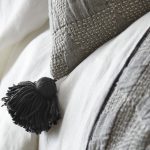 For an ensemble that looks collected yeas of adventure, pair Zion with the textured Evol duvet cover and top with Teton, a lush linen quilt with eyelash edge details appliquéd in a broken geometric design. Add unique accents like the Astrid Dutch Euro in Asphalt, the Montgomery Bolster and Alcott Bolster covered in hundreds of knots of hand macramé.