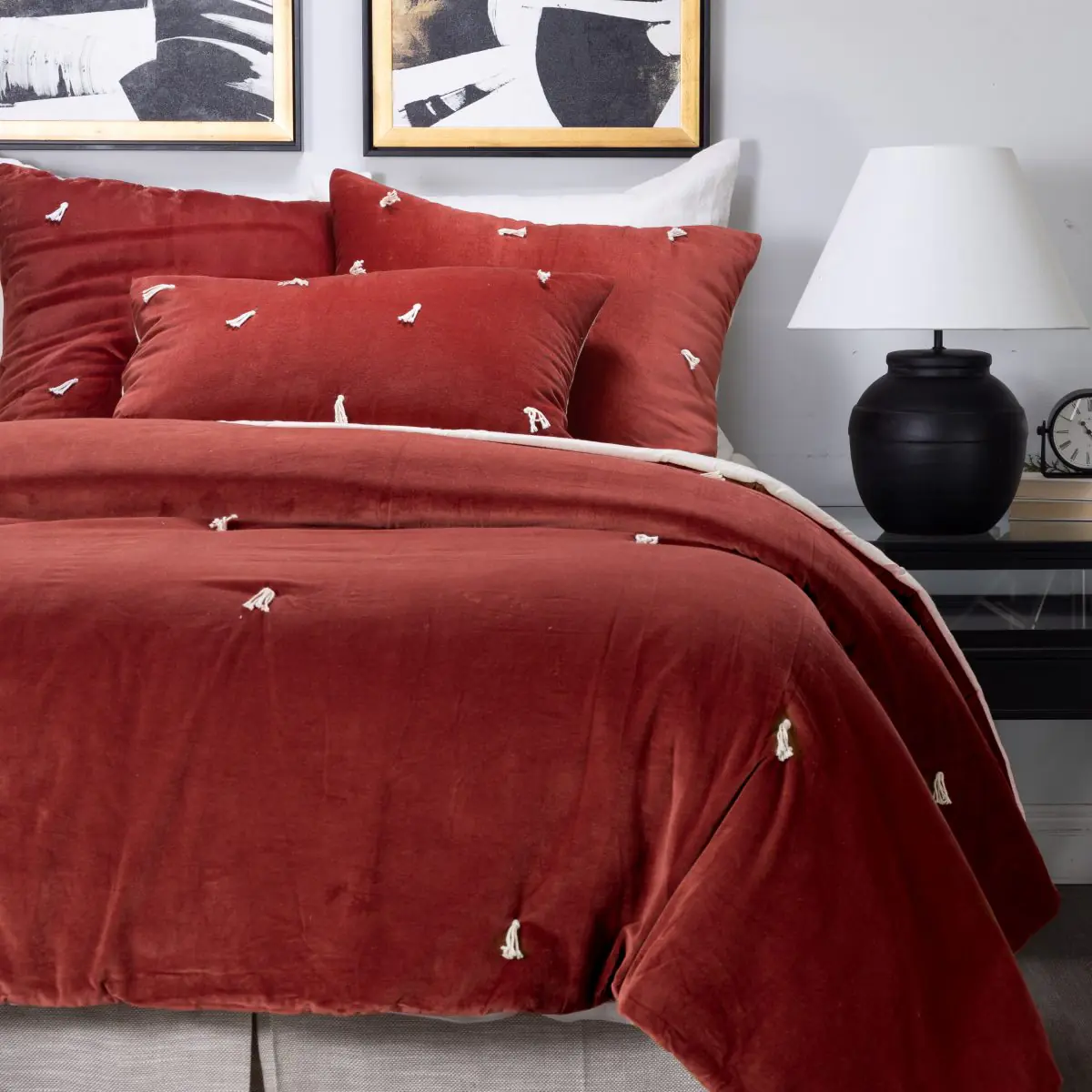 One way to achieve a lighter version of this trend would be to avoid using a heavy duvet and only use a touch of floor-length velvet by way of the Lia Velvet Bed Skirt to ground your bedroom. This gives you the opportunity to introduce the elegant texture of velvet without the commitment of the full warmth of a velvet bedding set.